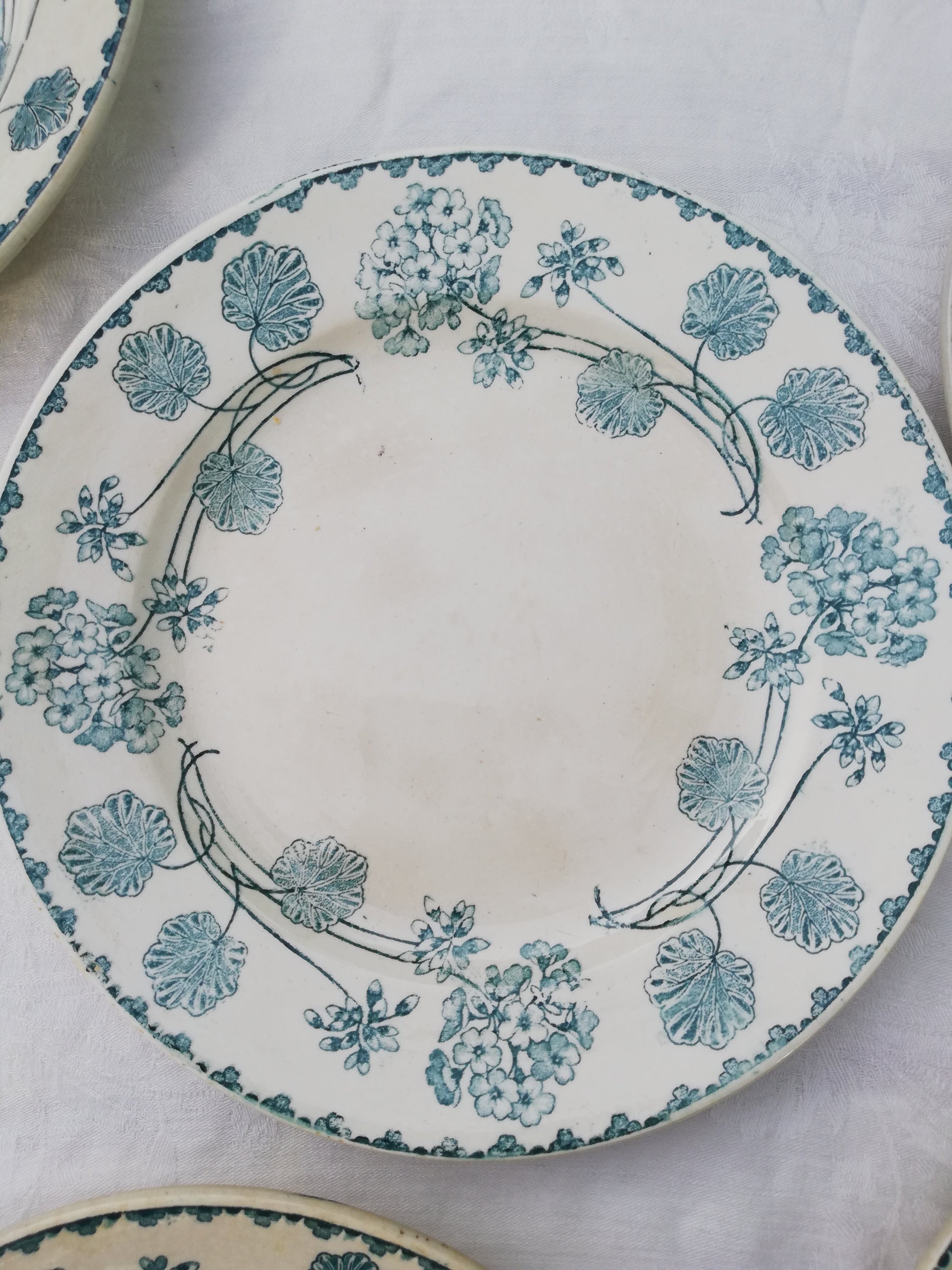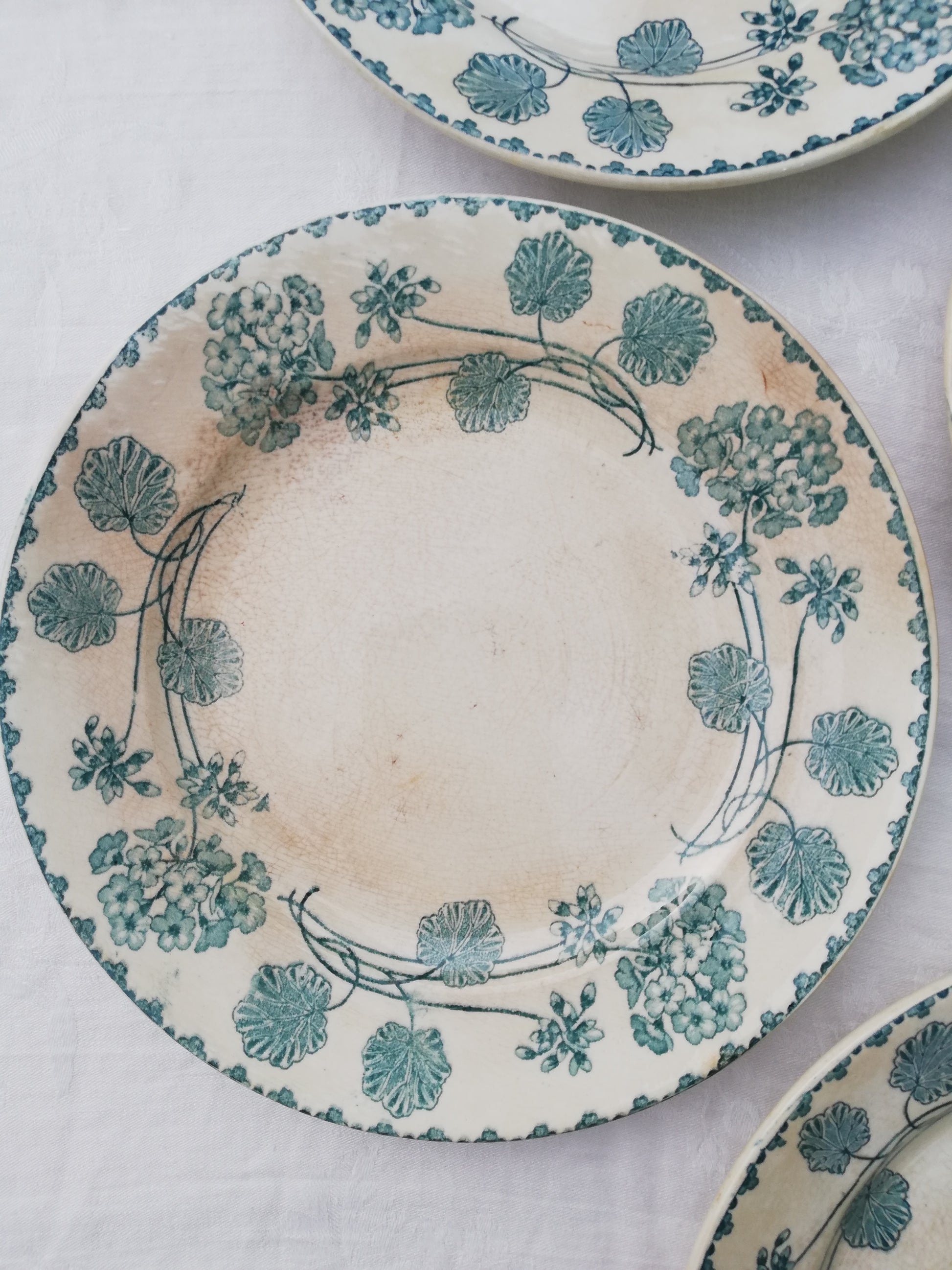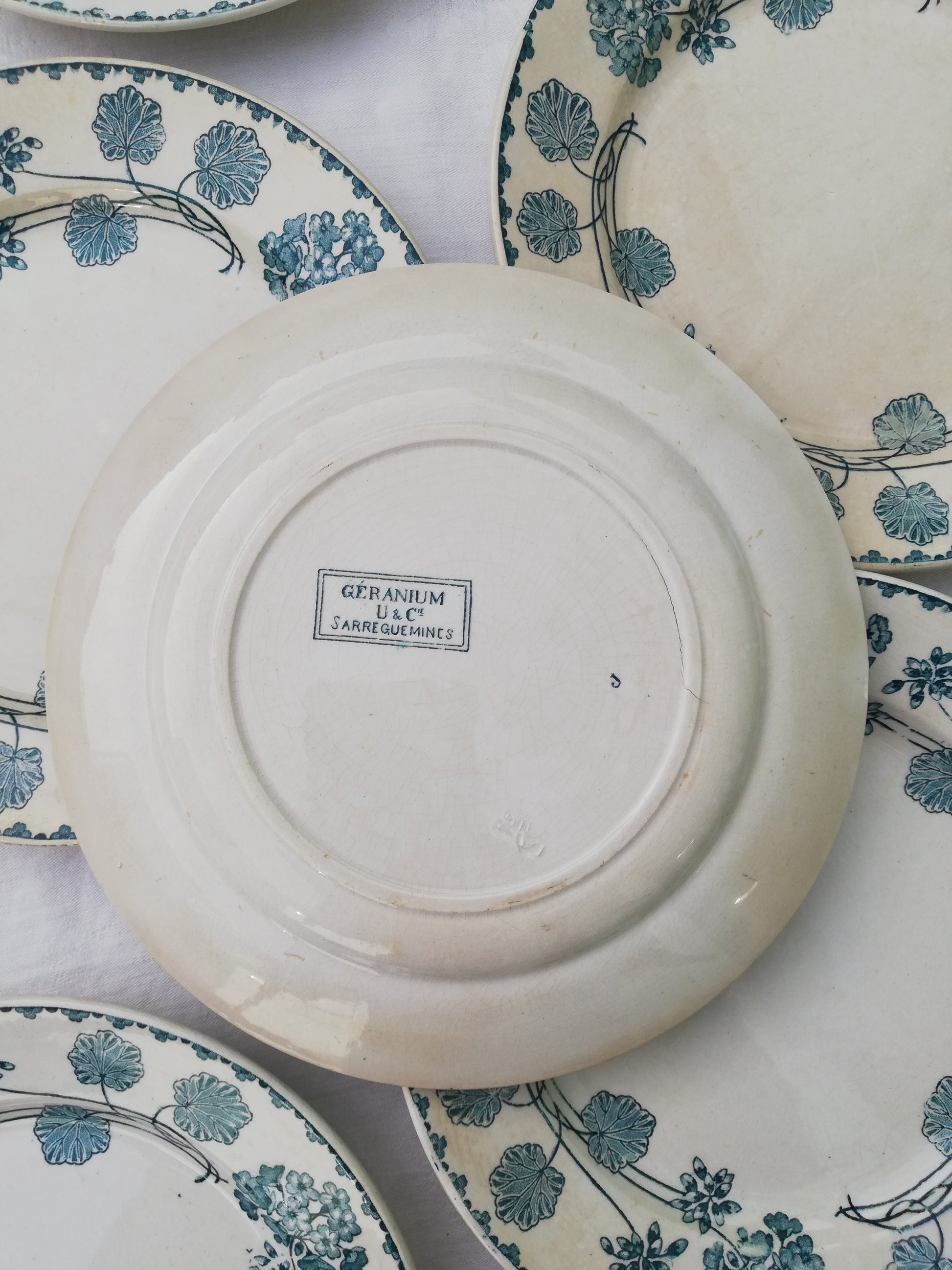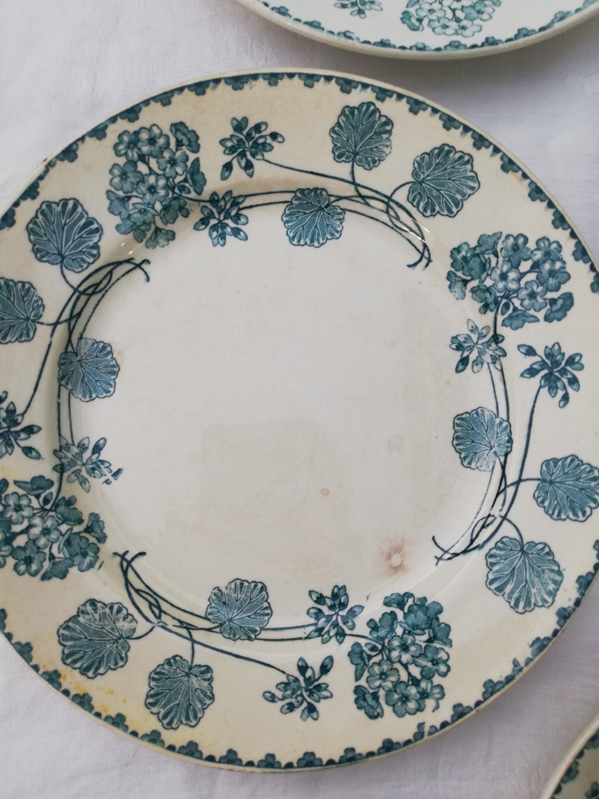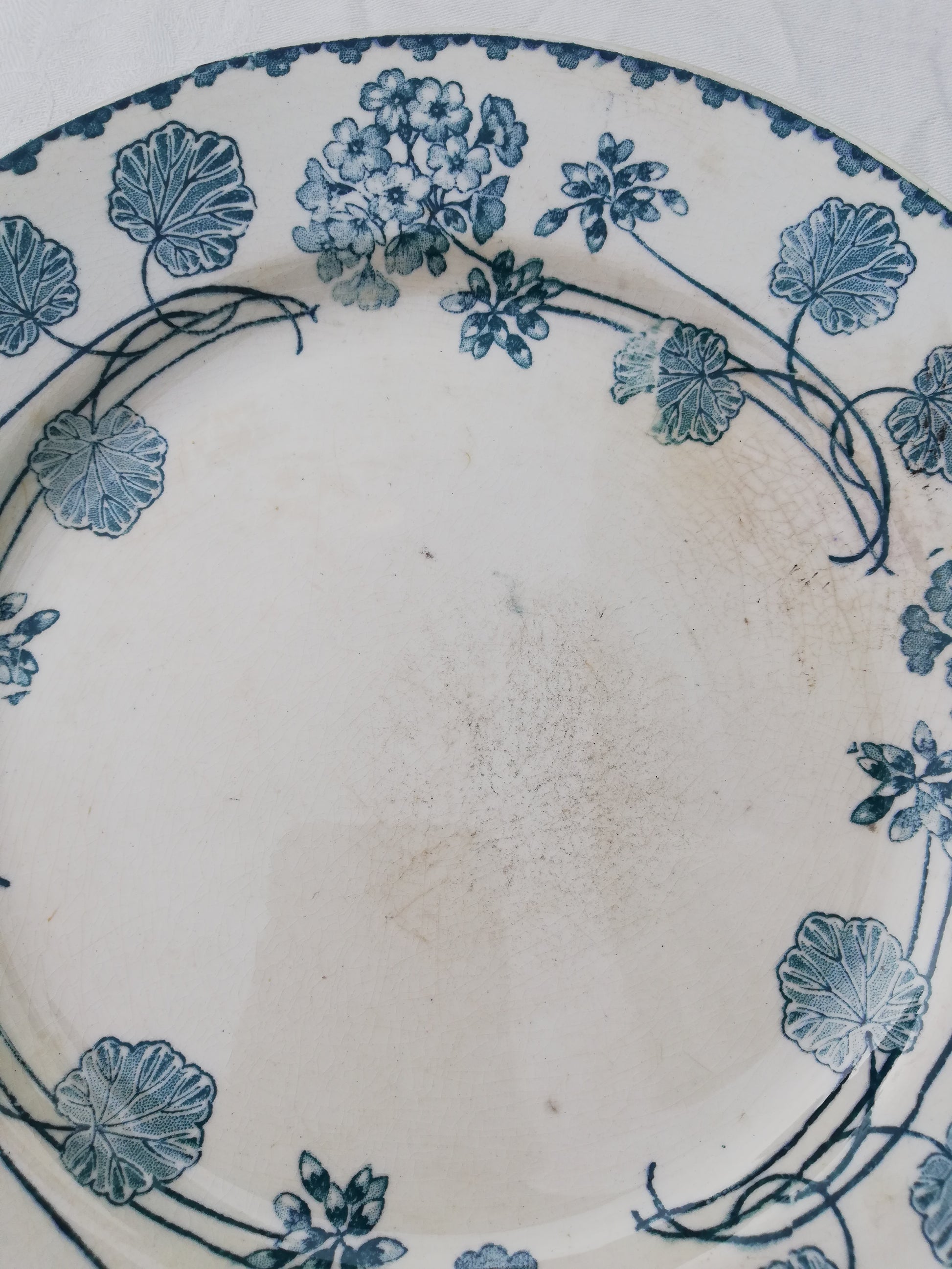 Assiette à dessert ou entremet de la manufacture de Sarreguemines modèle Géranium en terre de fer bleu vert