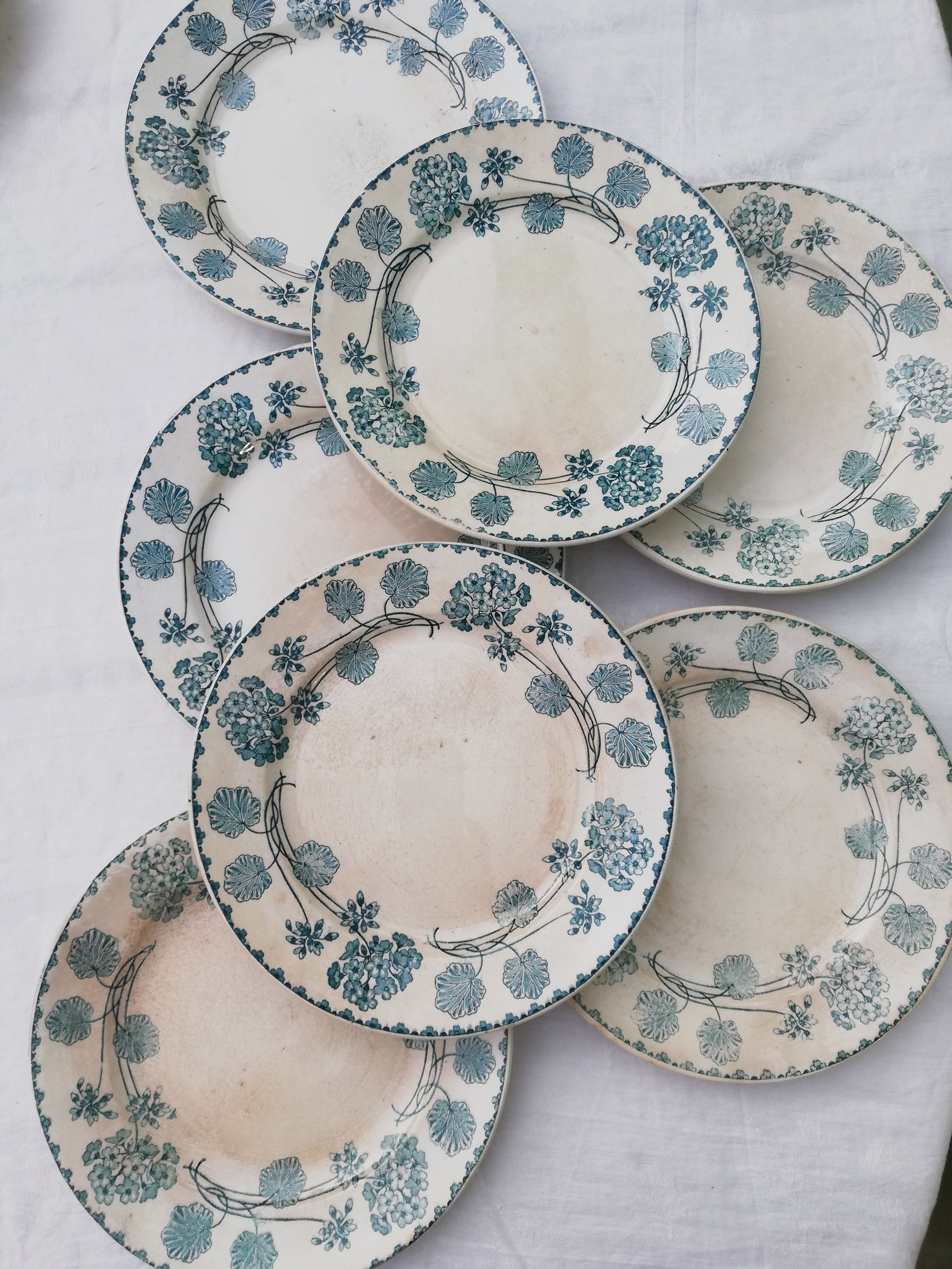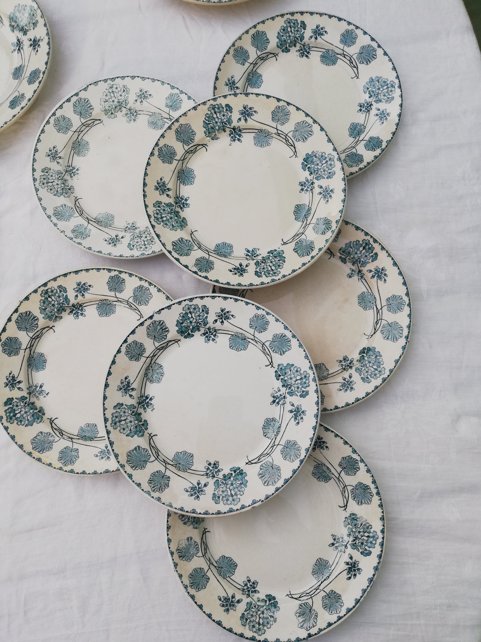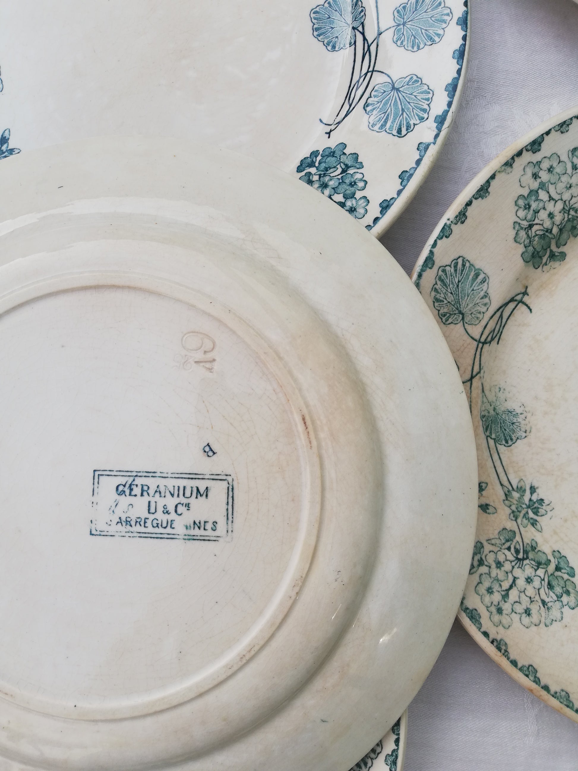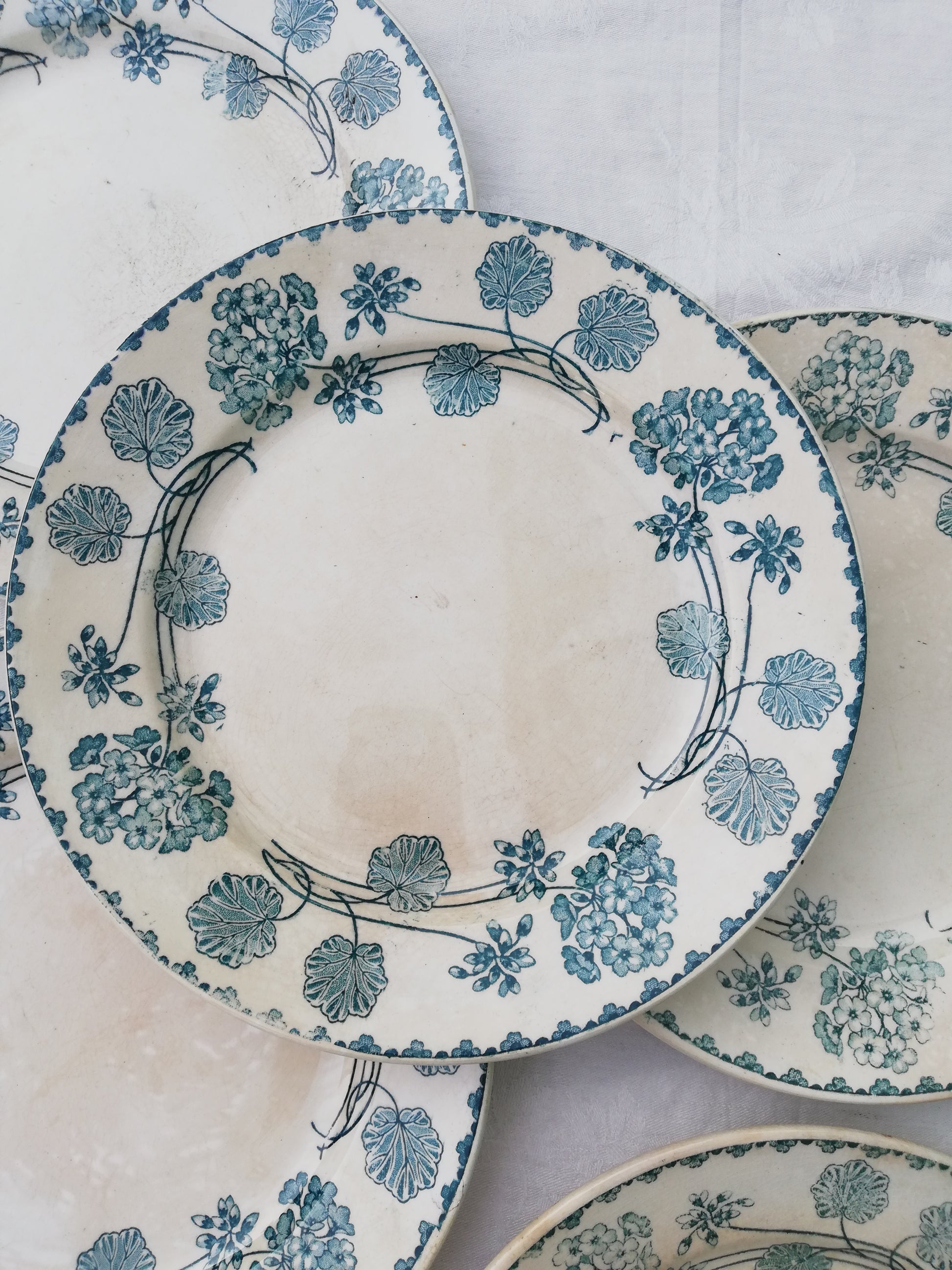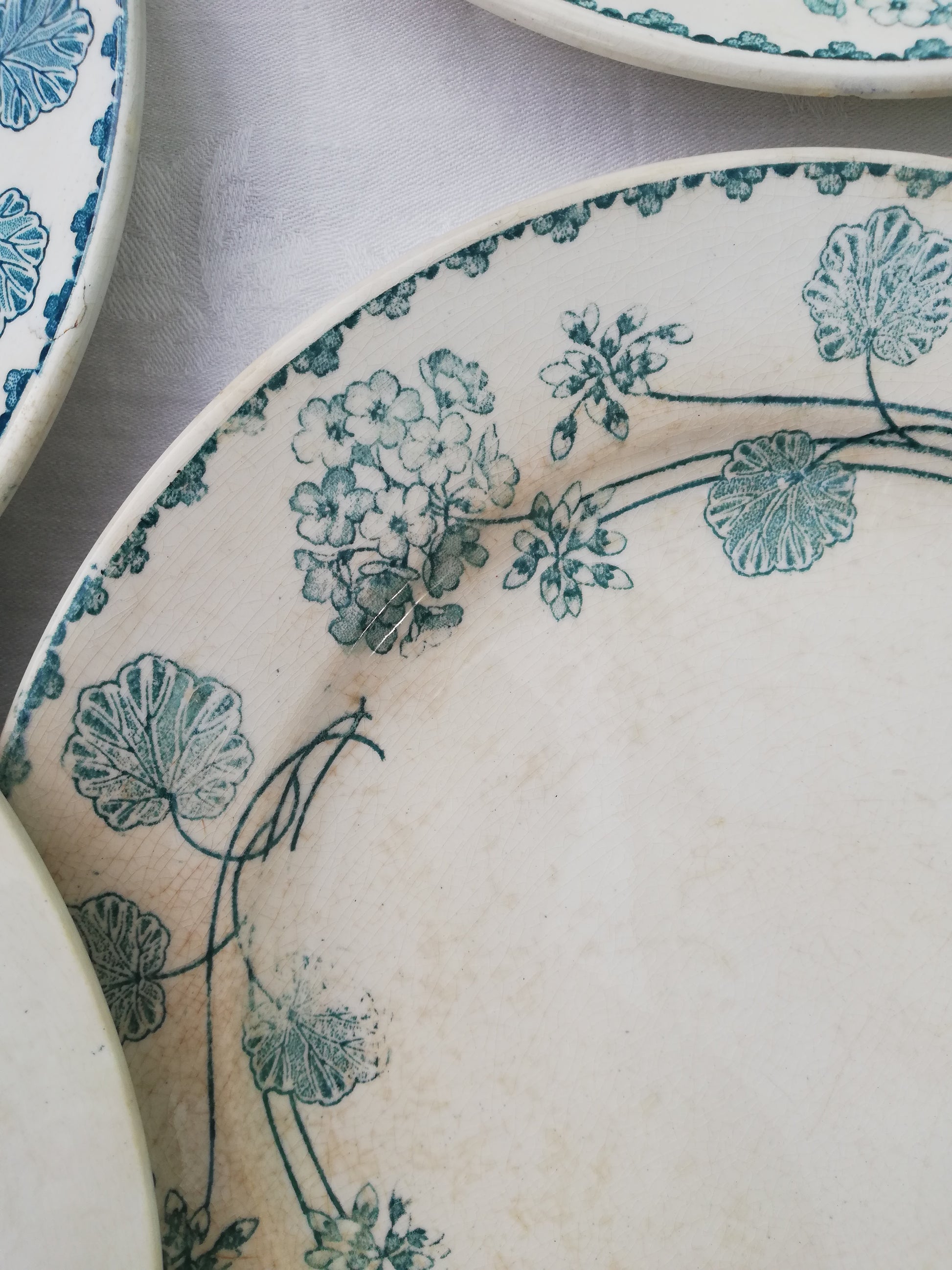 Assiette à dessert ou entremet de la manufacture de Sarreguemines modèle Géranium en terre de fer bleu vert