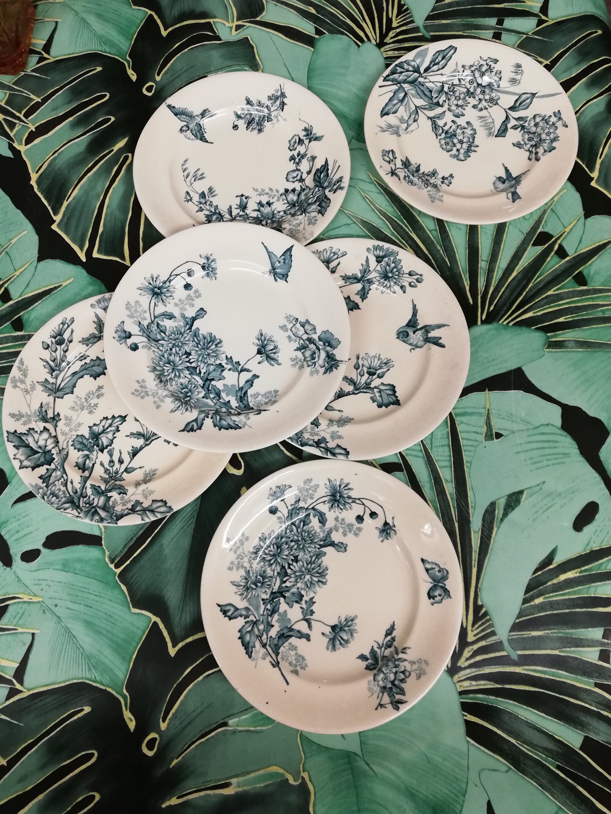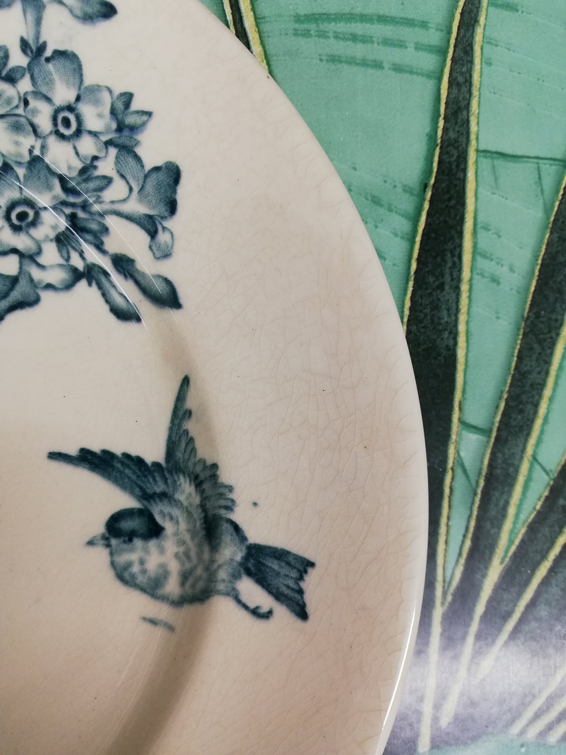 Daté de 1891 (tampon), ce modèle représente des fleurs, papillons, et oiseau.