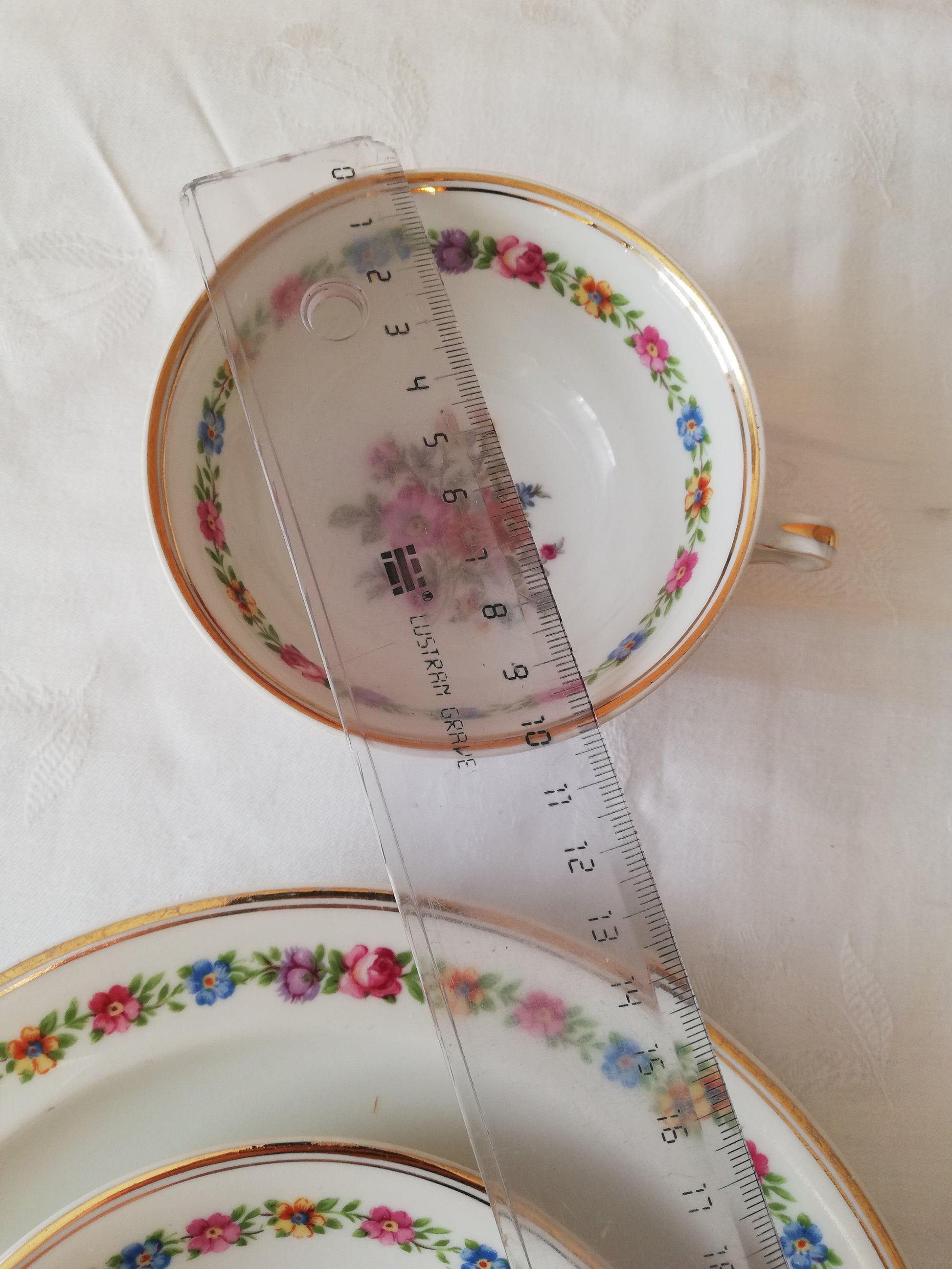 Diamètre assiette 21 cm, sous tasse 14 cm, tasse 10 cm, hauteur tasse 4 cm