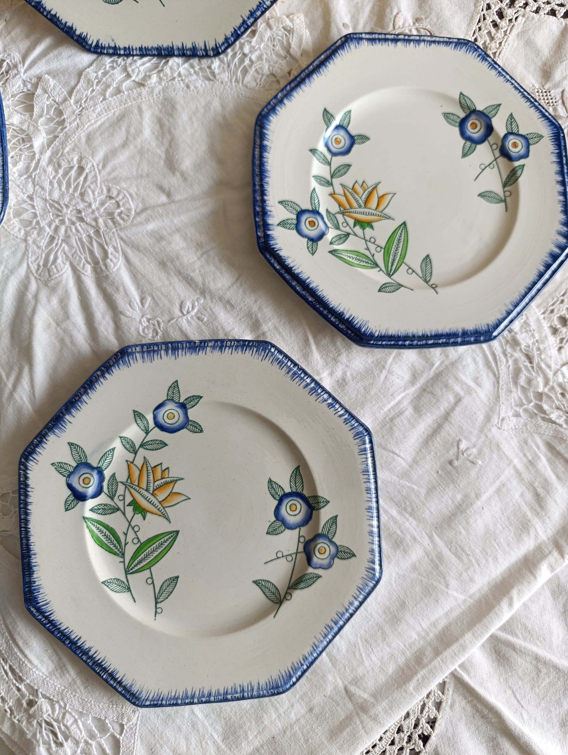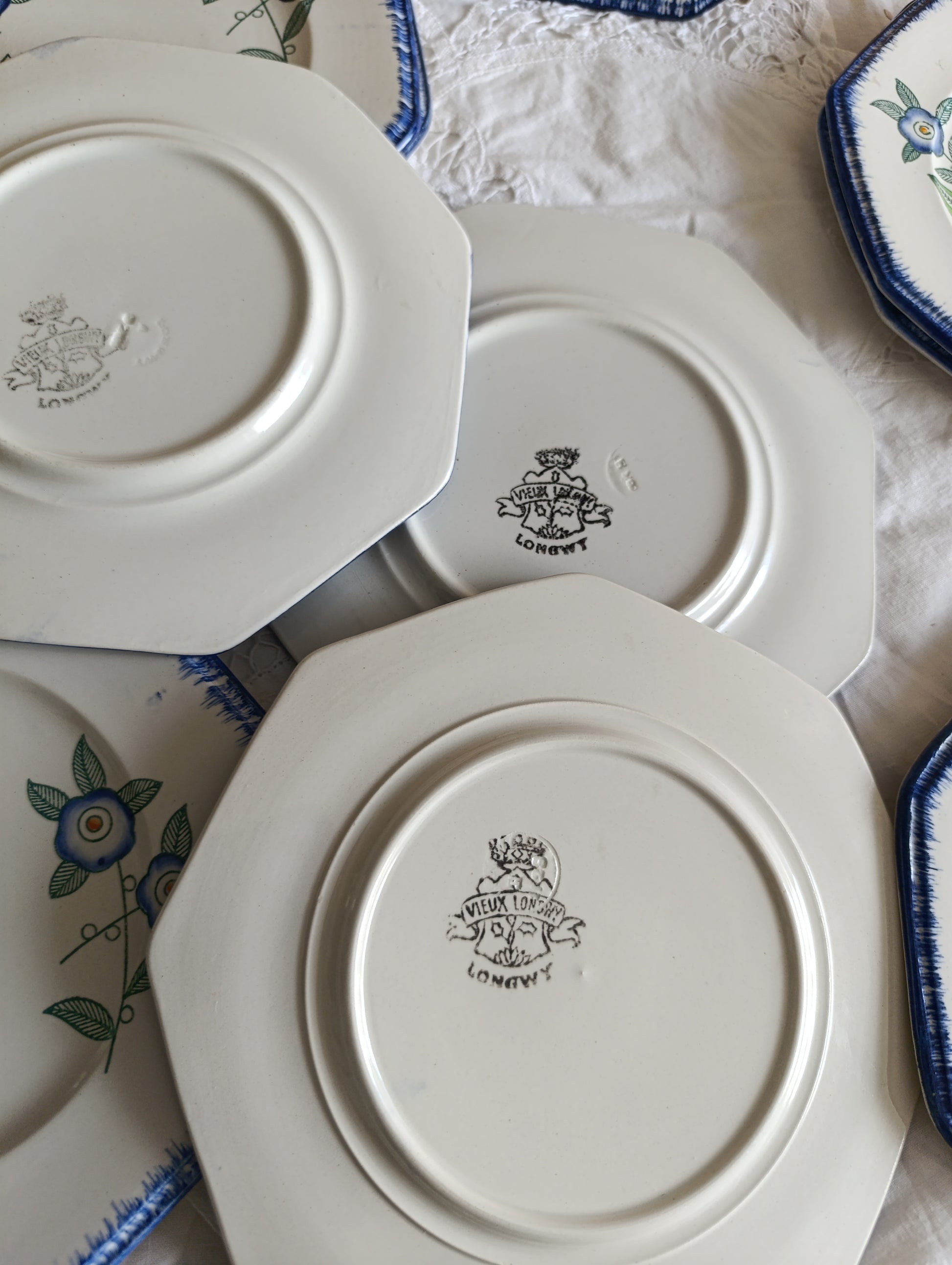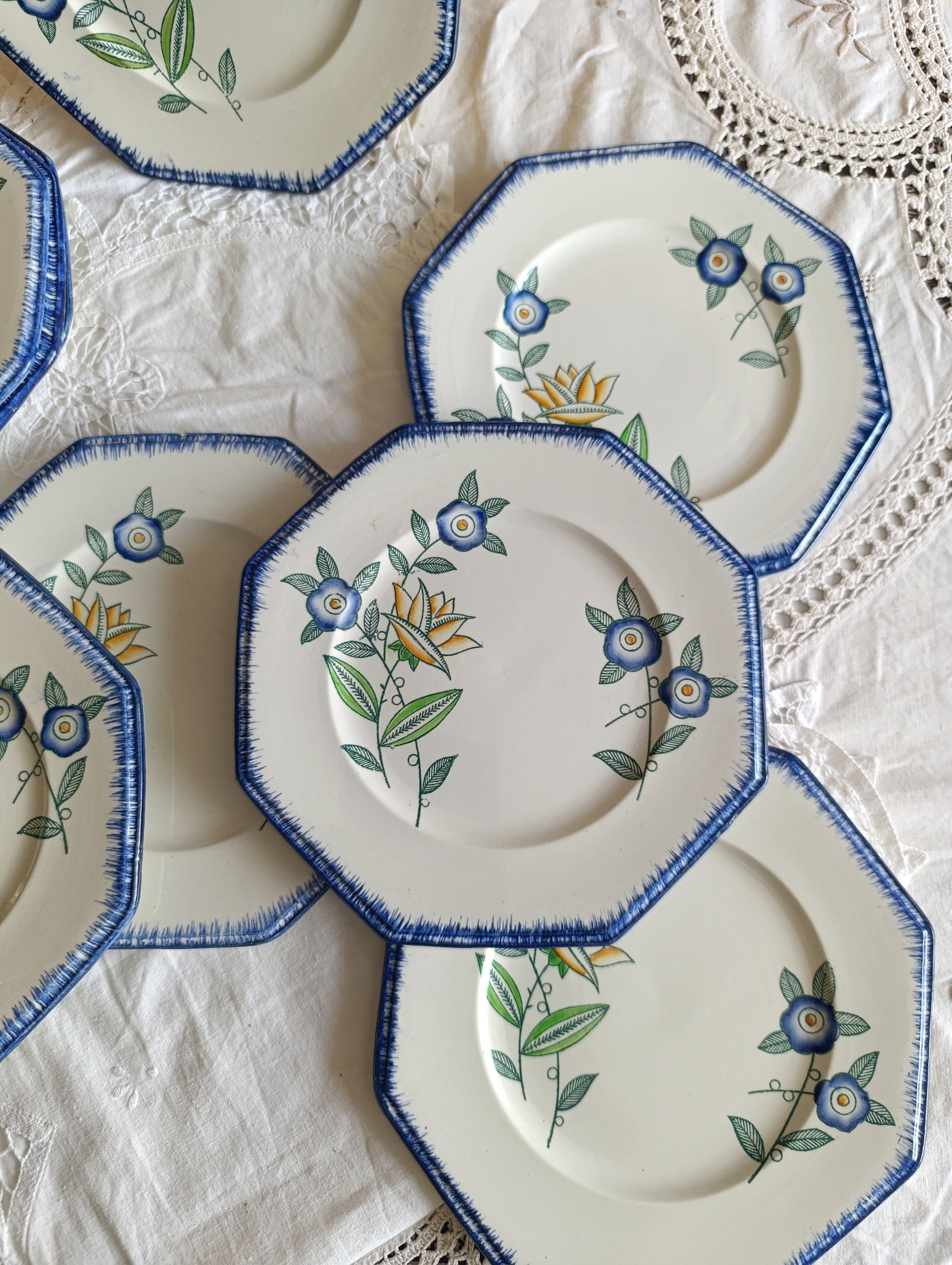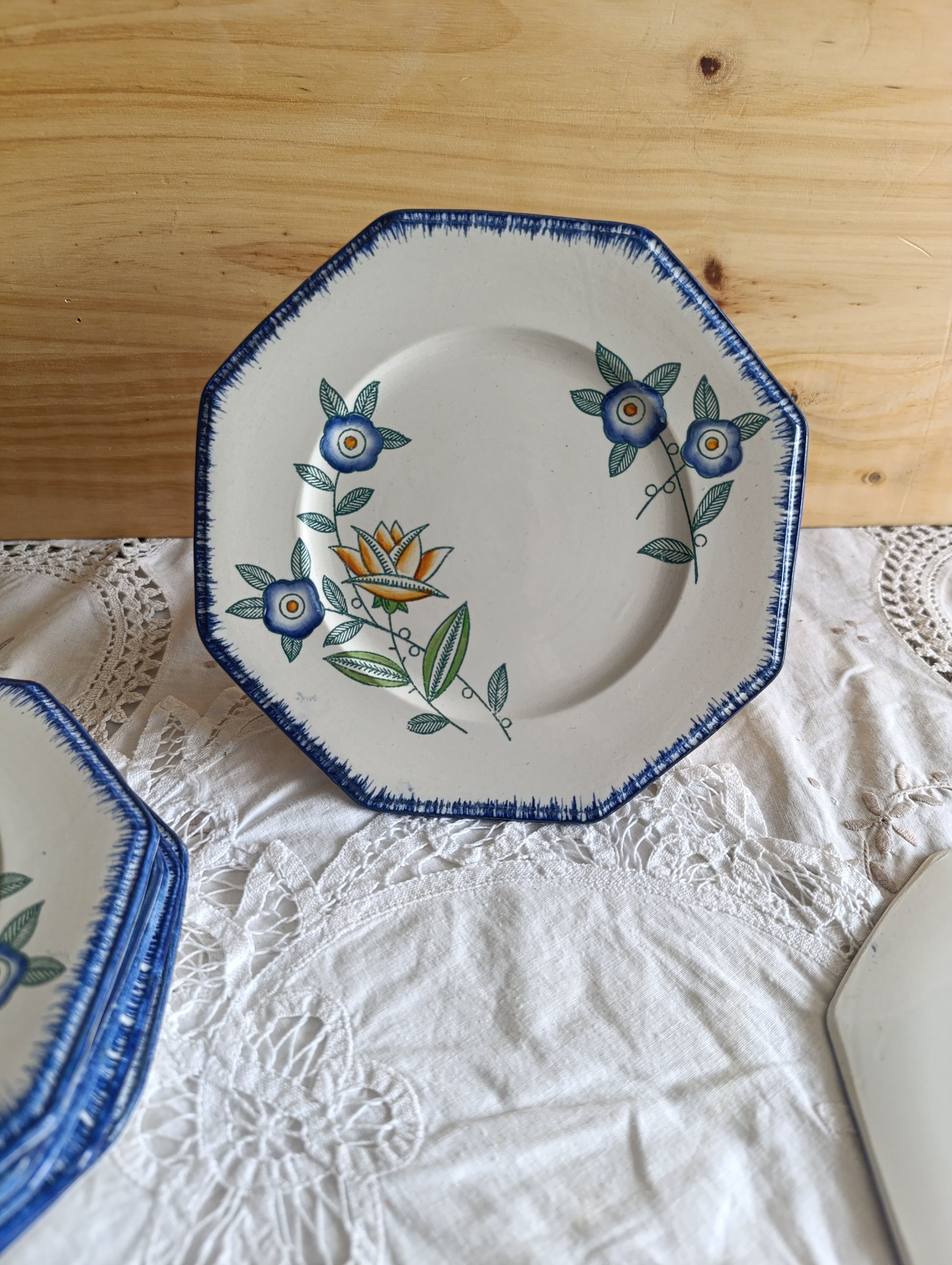 Assiette à dessert octogonal en terre de fer polychrome modèle vieux Longwy de la manufacture de Longwy