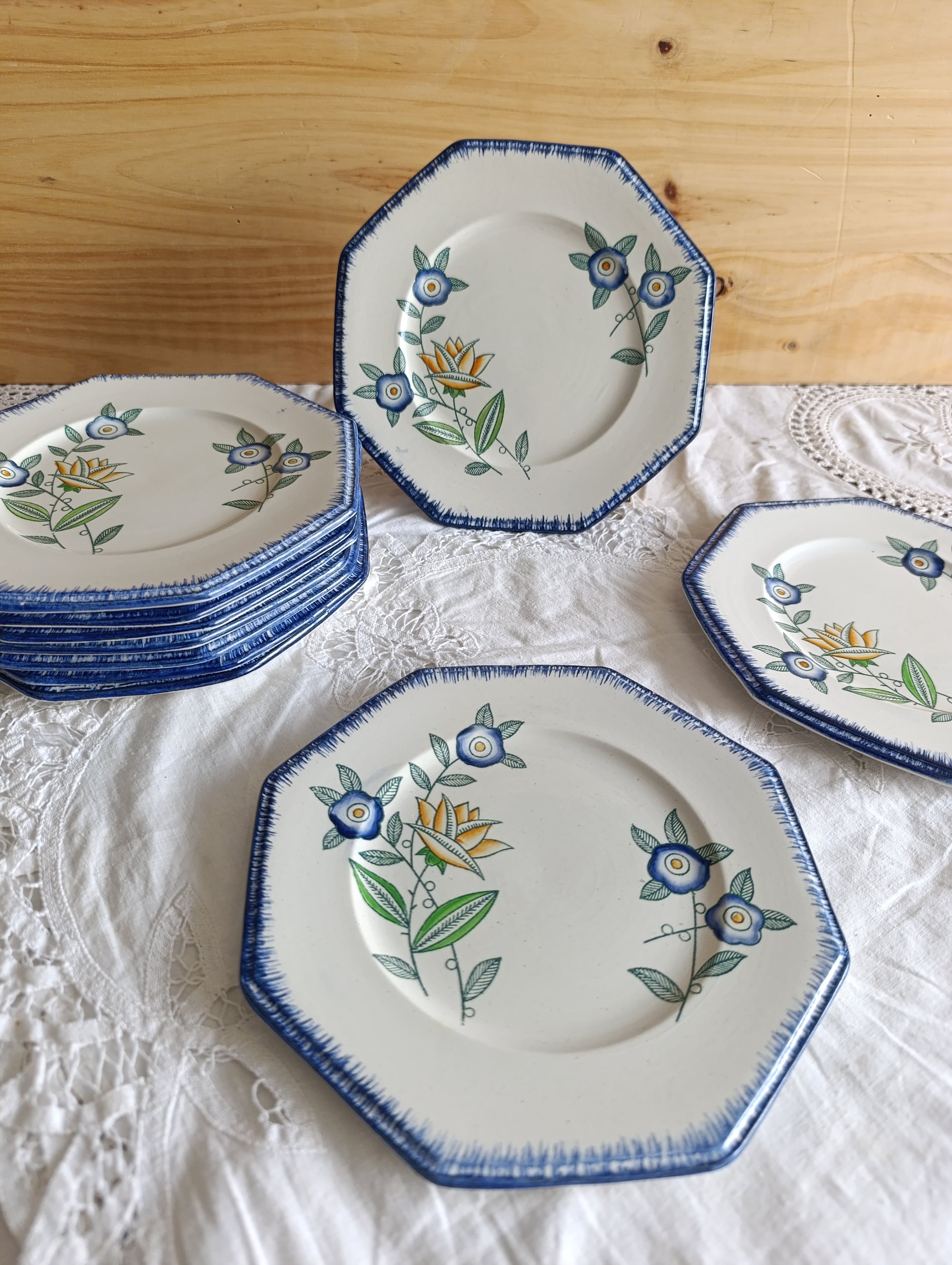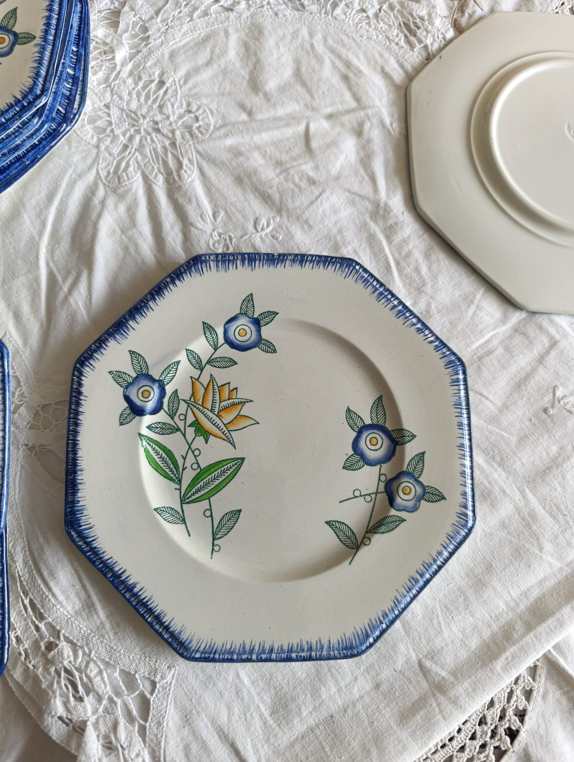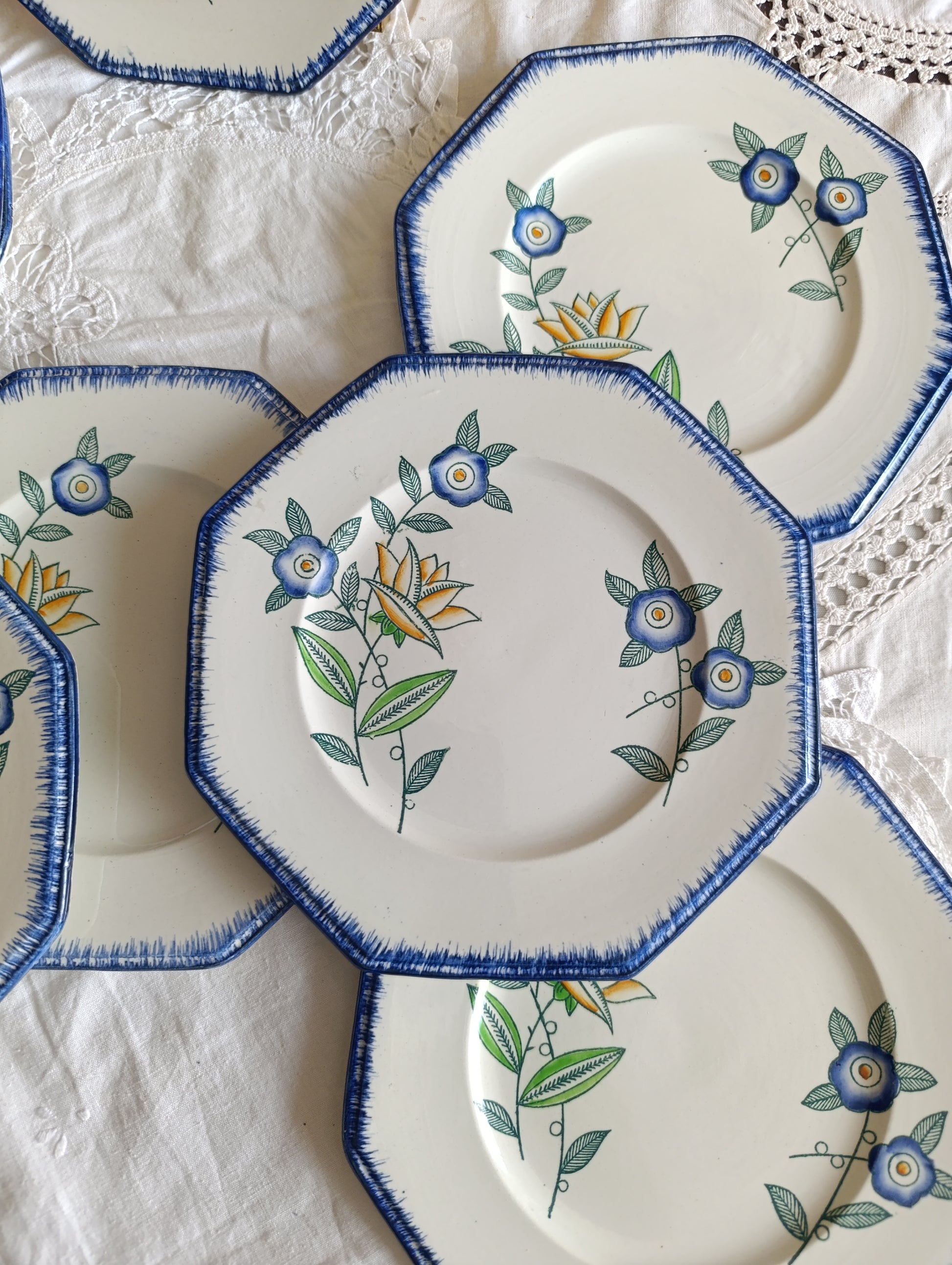 Assiette à dessert octogonal en terre de fer polychrome modèle vieux Longwy de la manufacture de Longwy