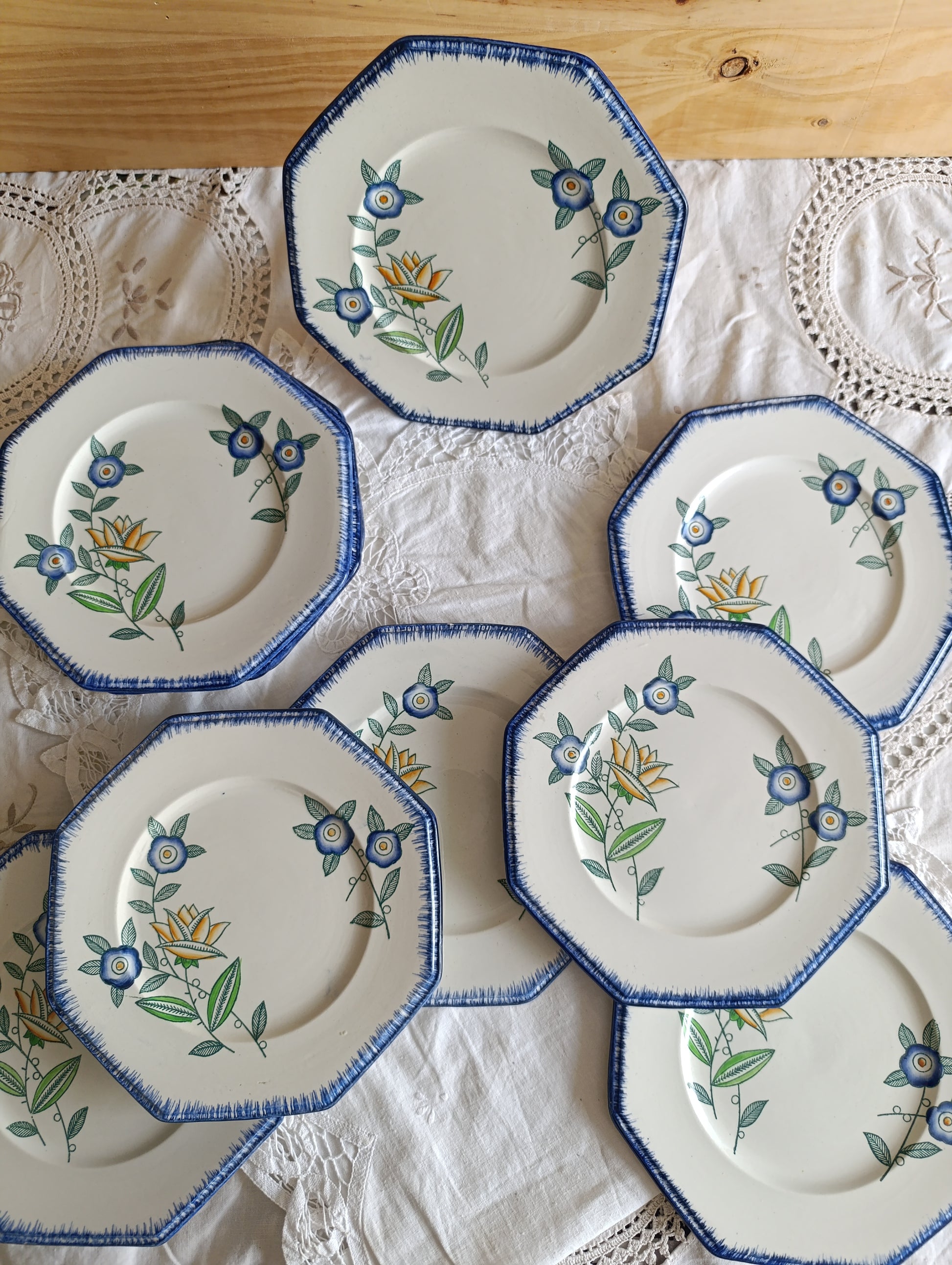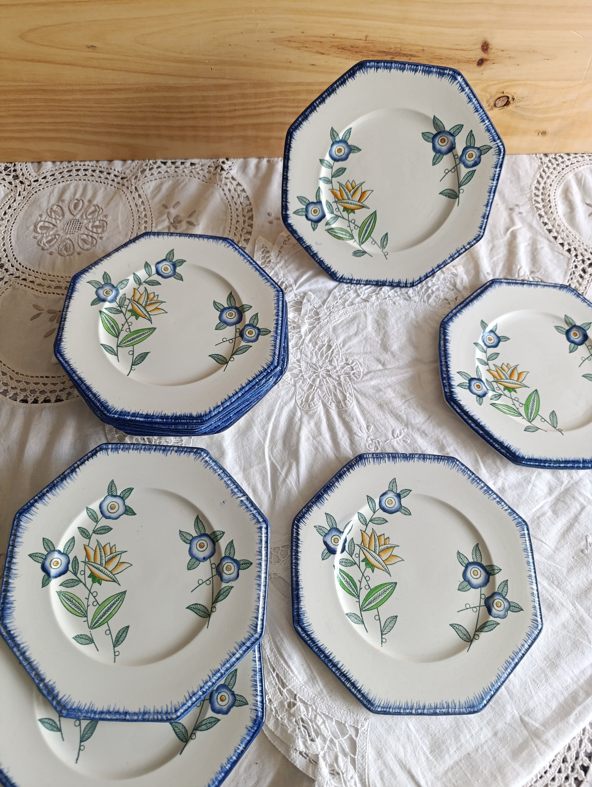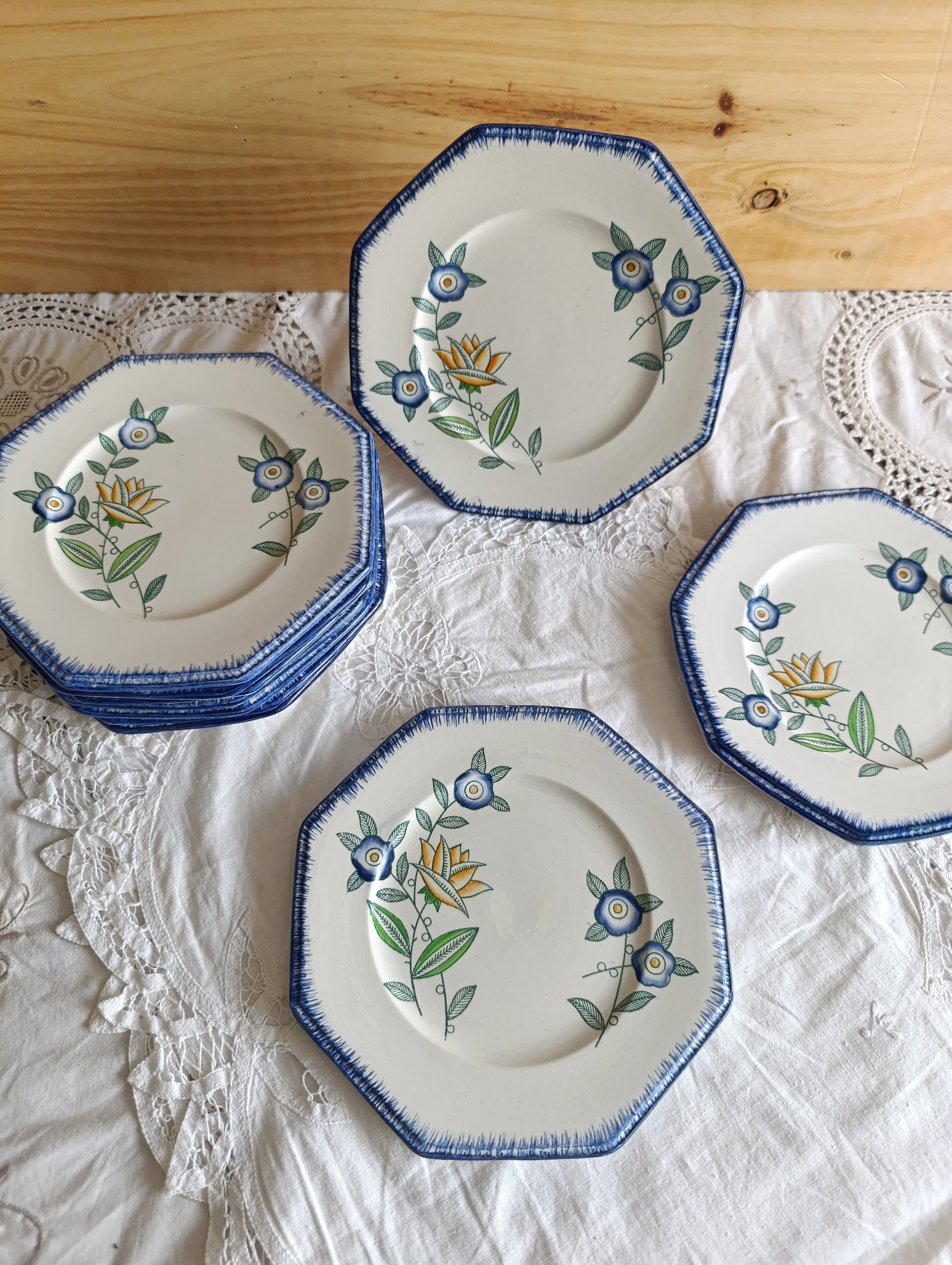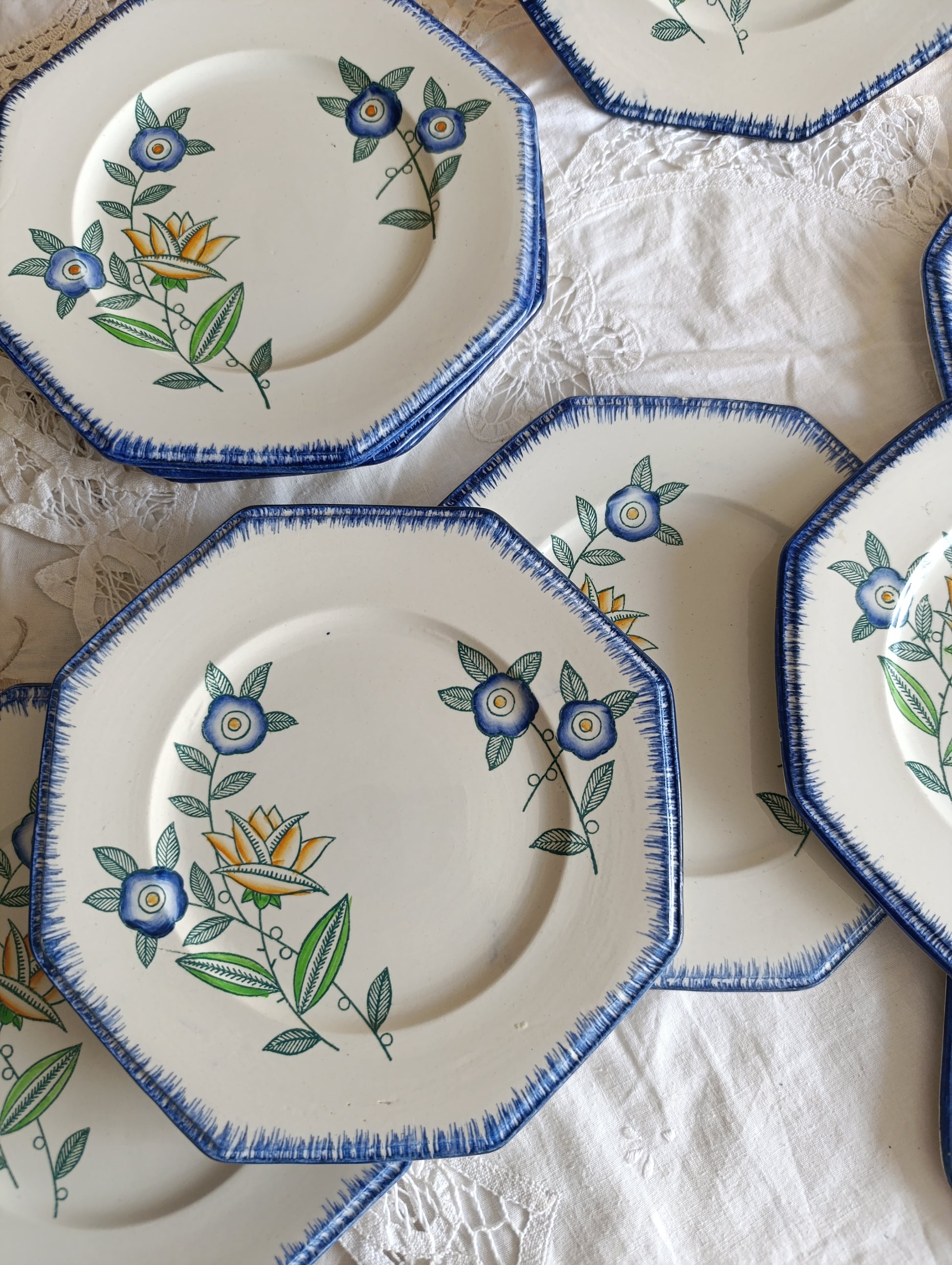Assiette à dessert octogonal en terre de fer polychrome modèle vieux Longwy de la manufacture de Longwy