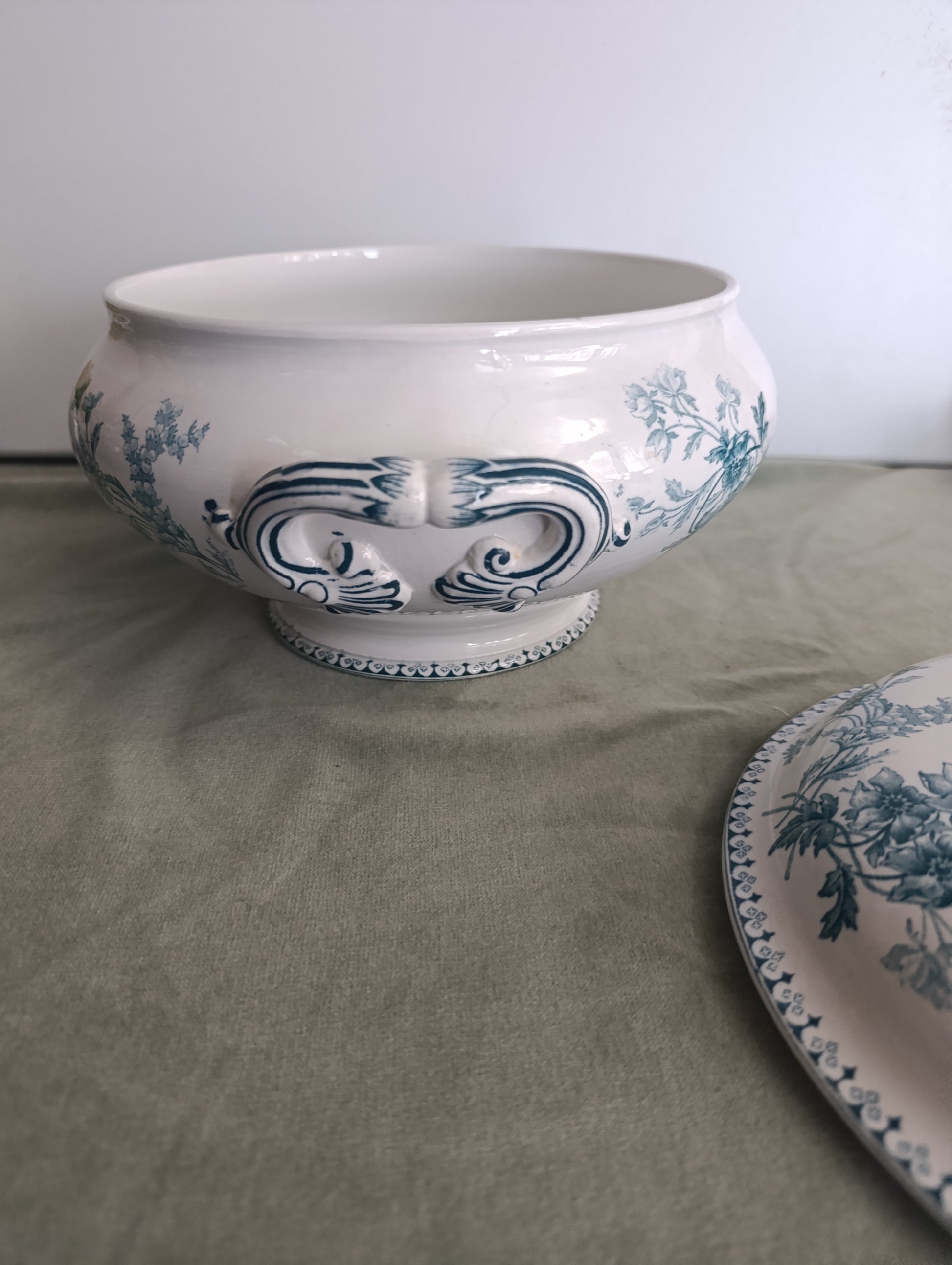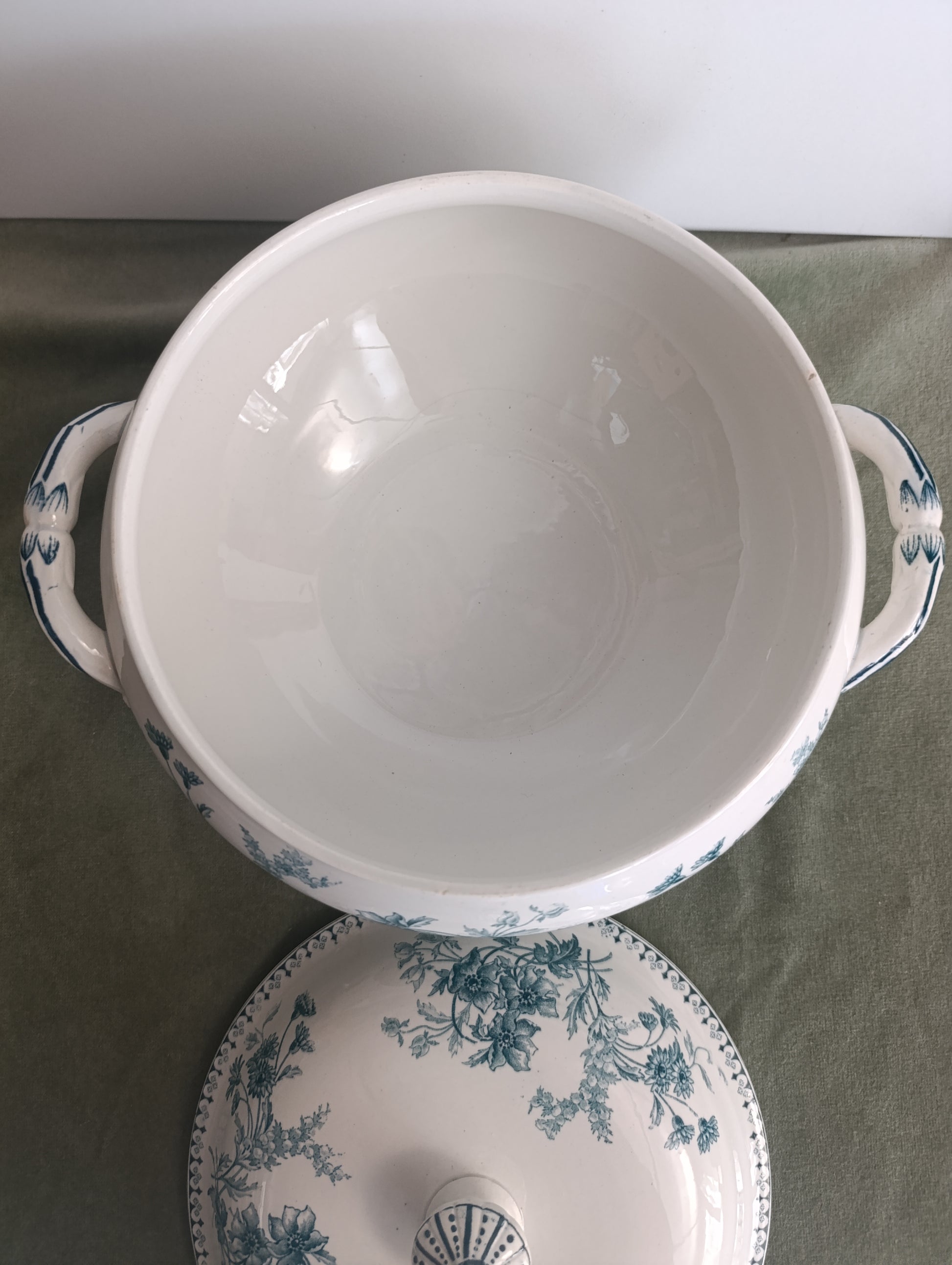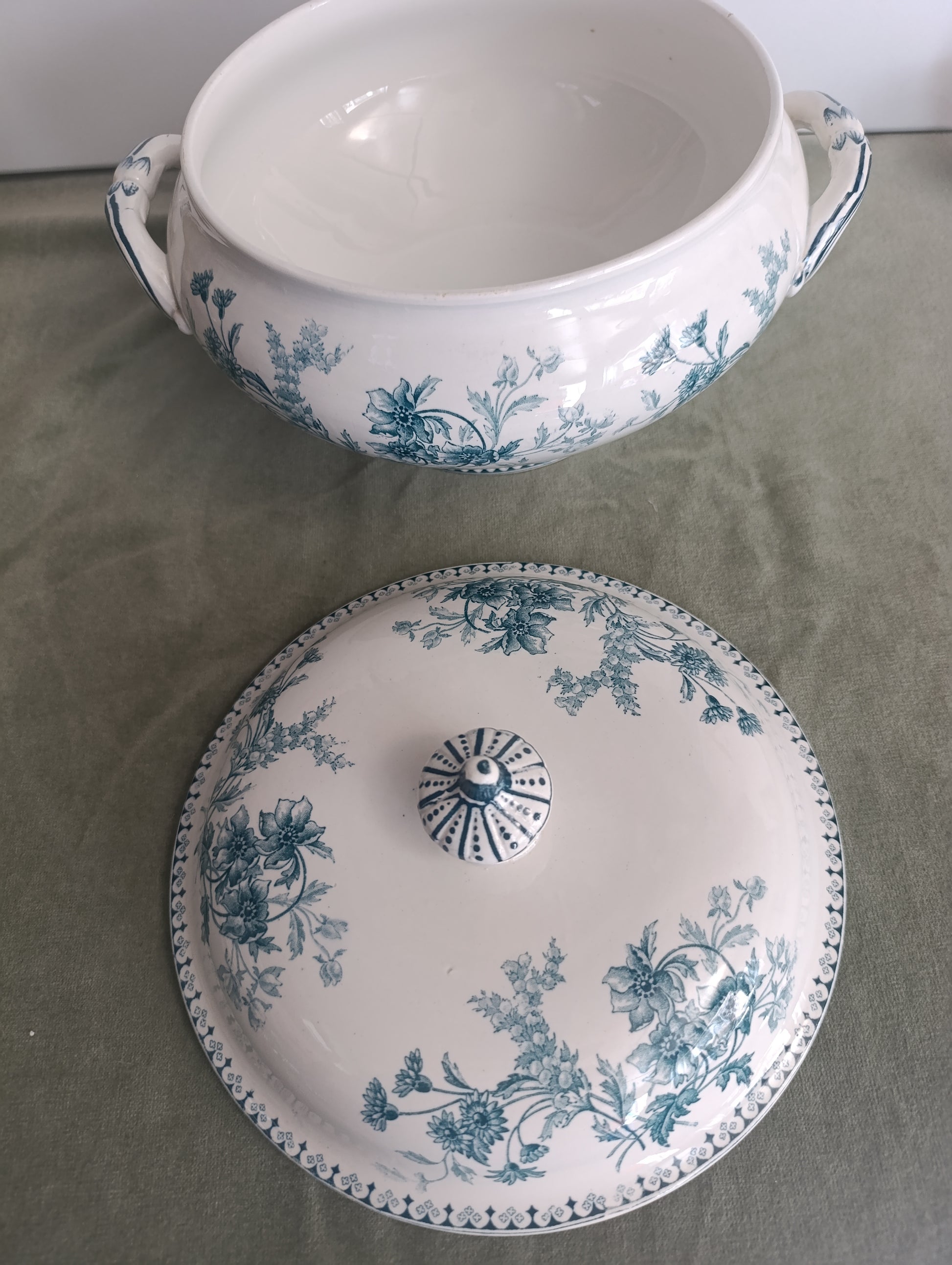 Magnifique soupière modèle Elvire de la manufacture de Sarreguemines en terre de fer bleu vert