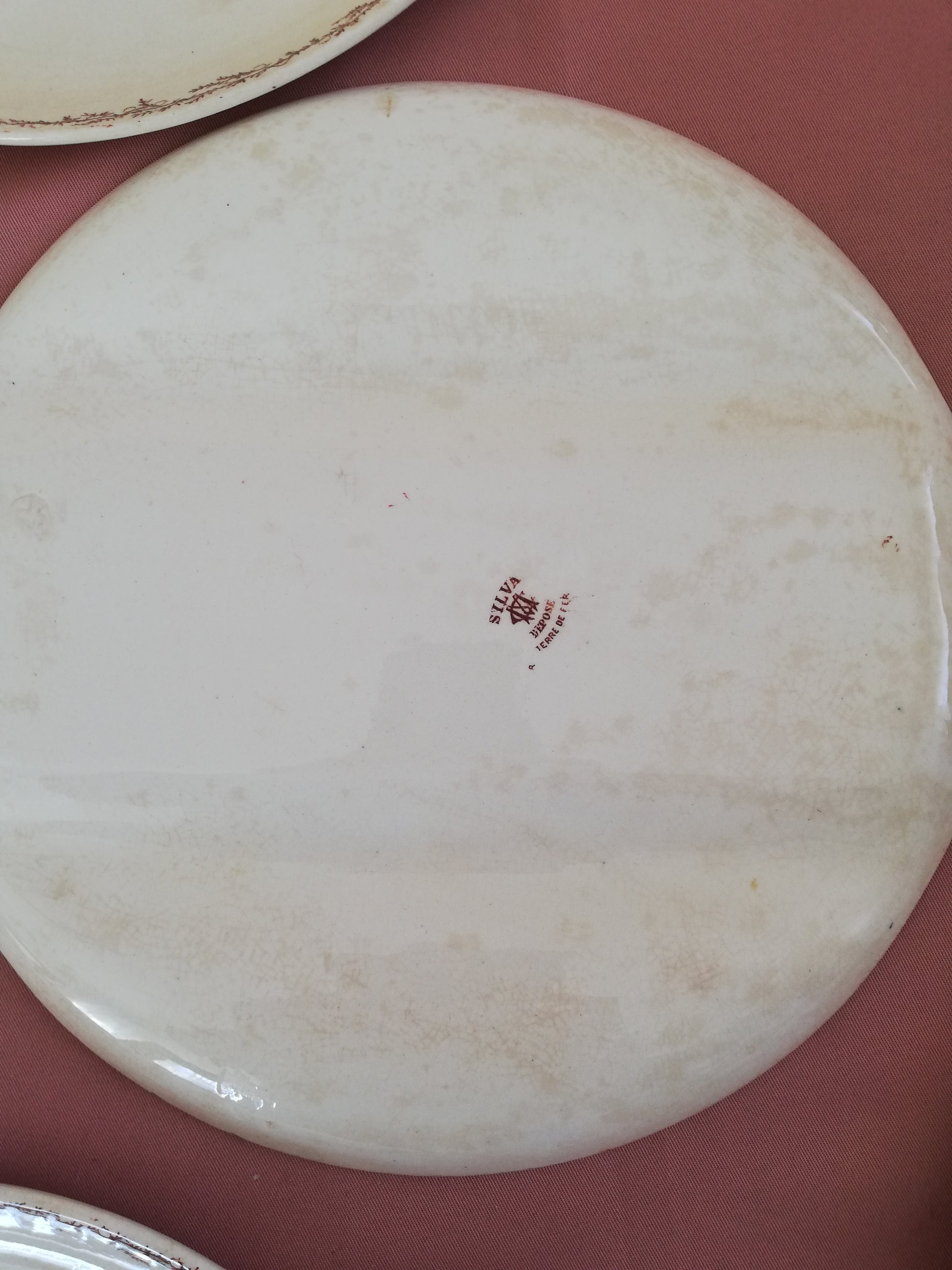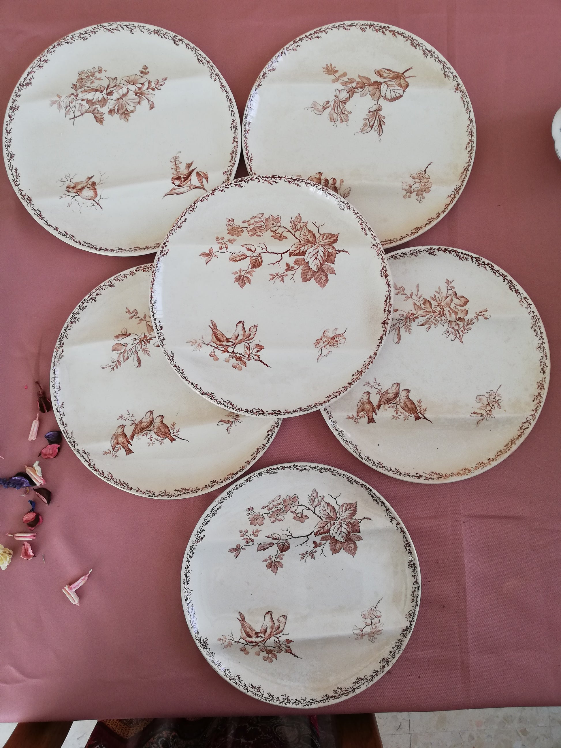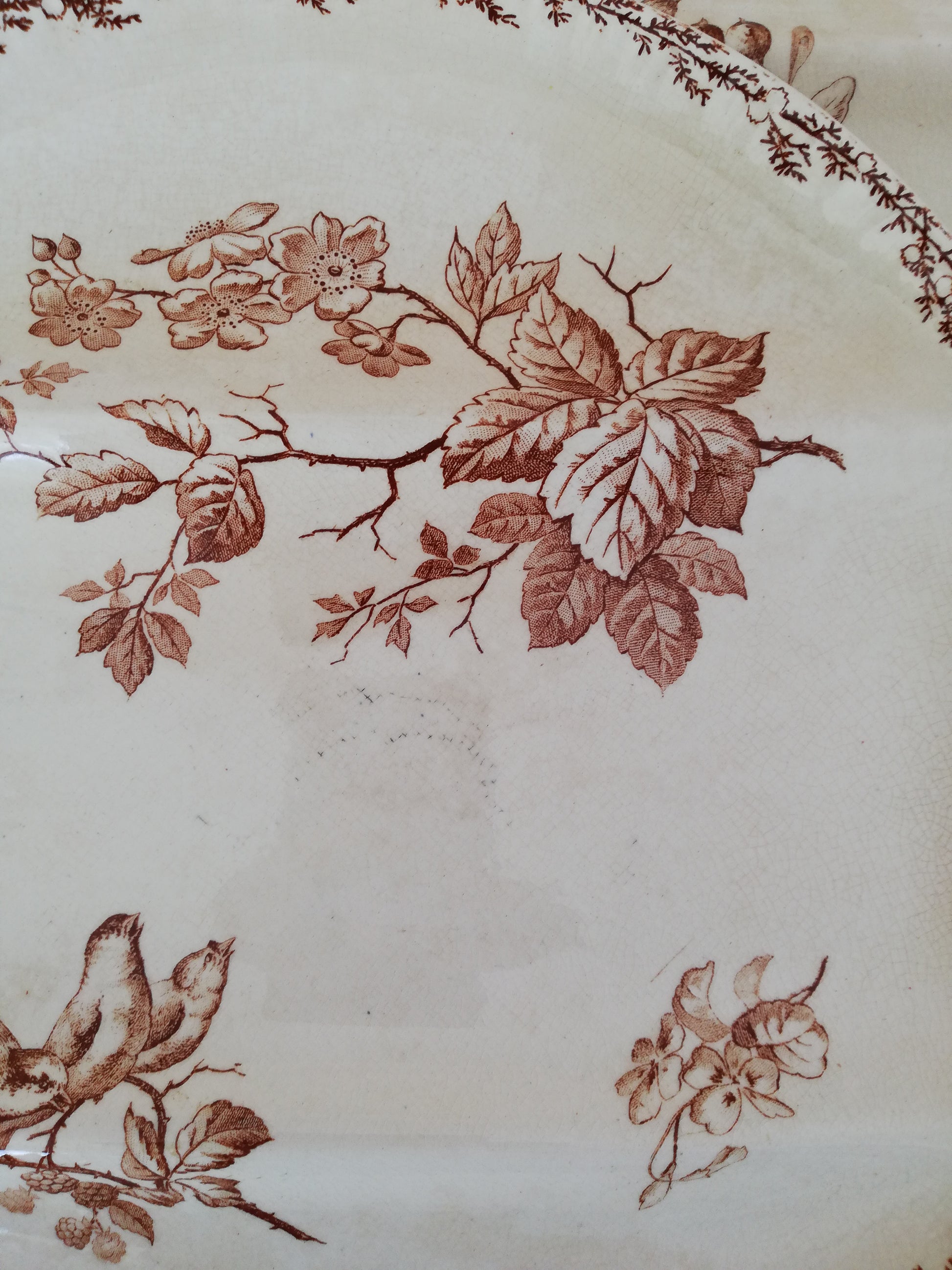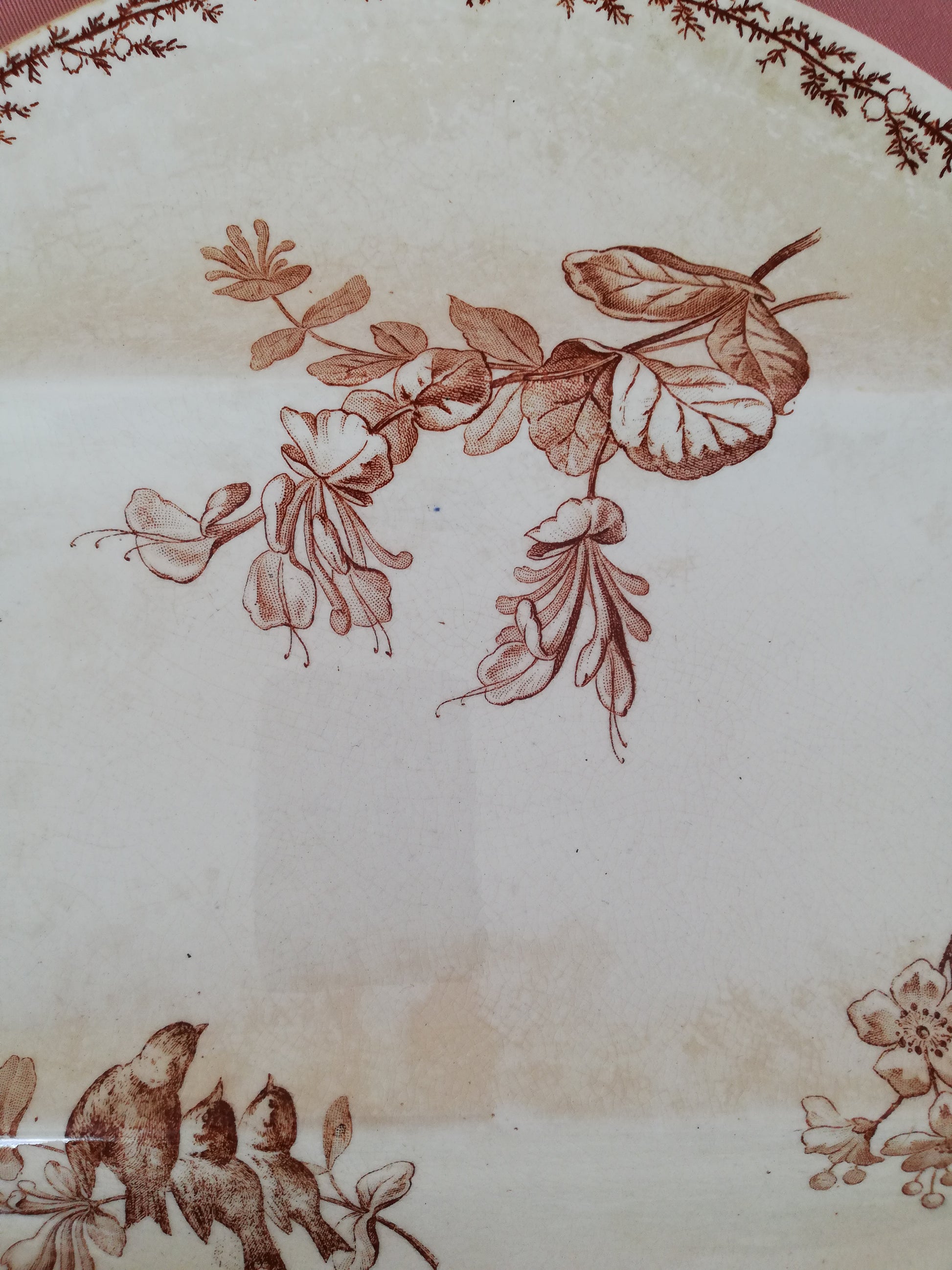 Assiette à asperge compartimentée modèle Silva de Creil et Montereau en terre de fer brun à décor d oiseau