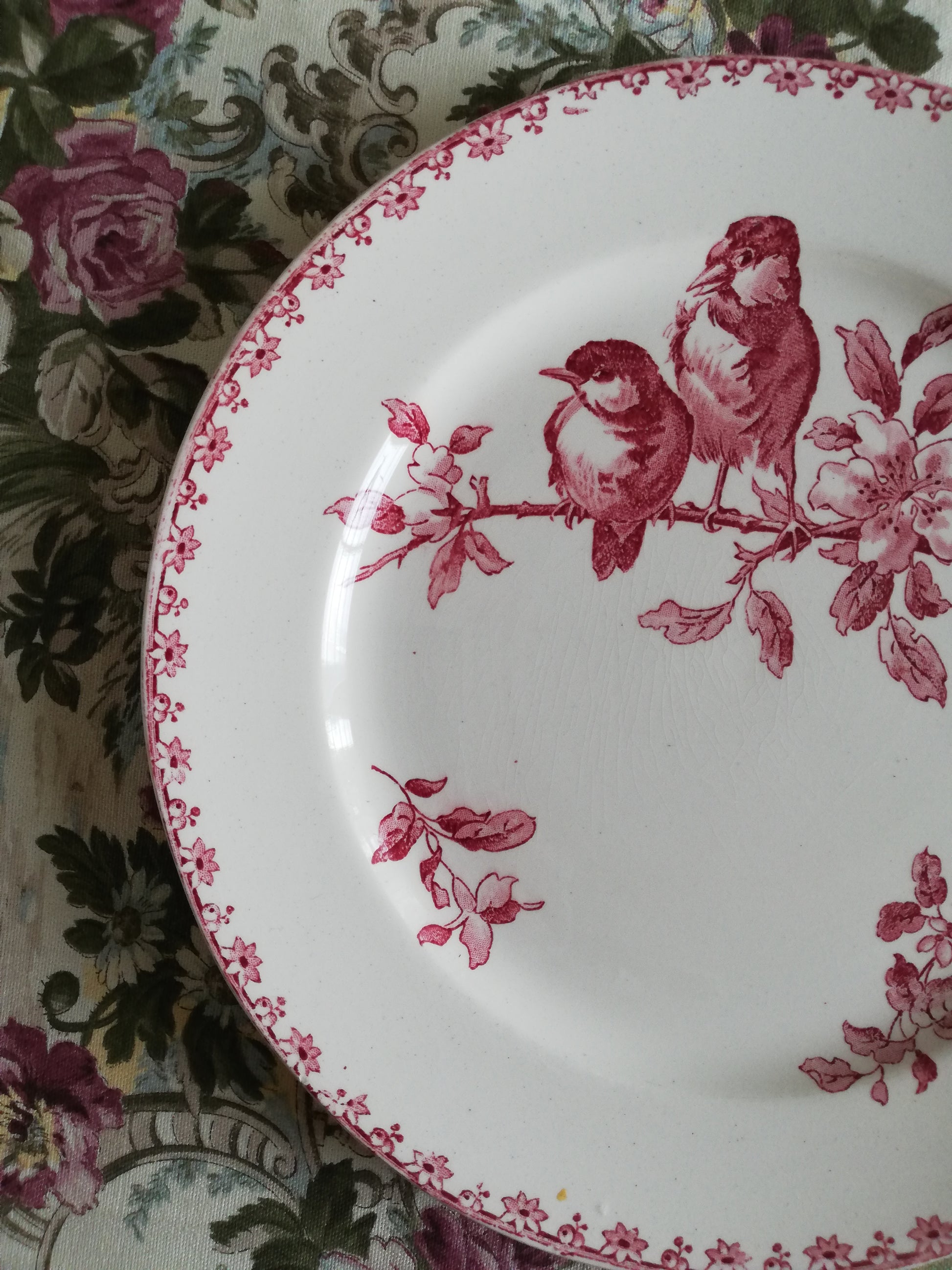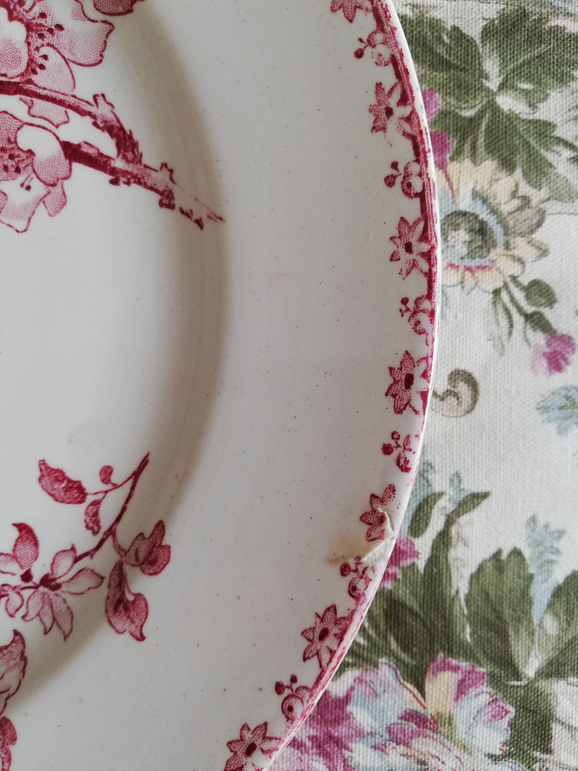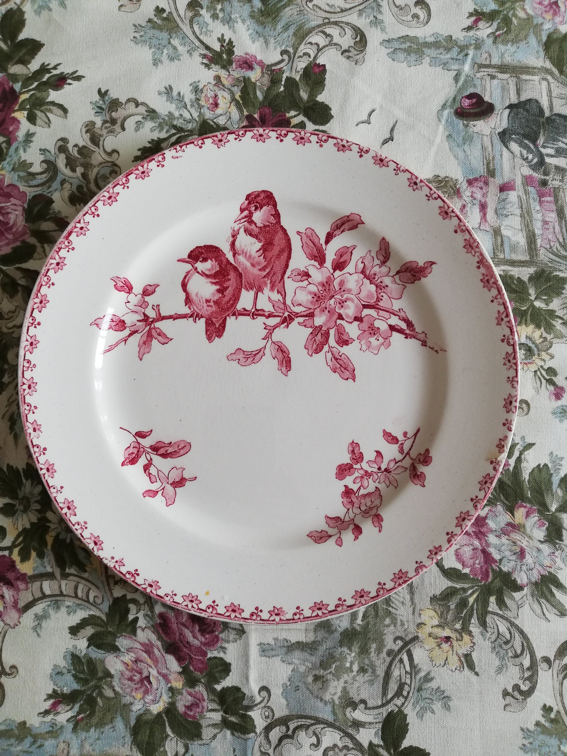 Assiette Favori de Sarreguemines en terre de fer rose avec petit défaut