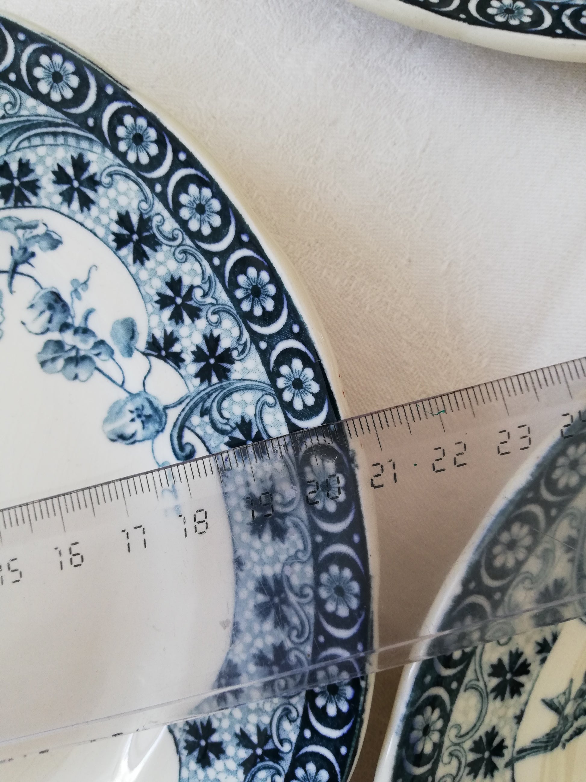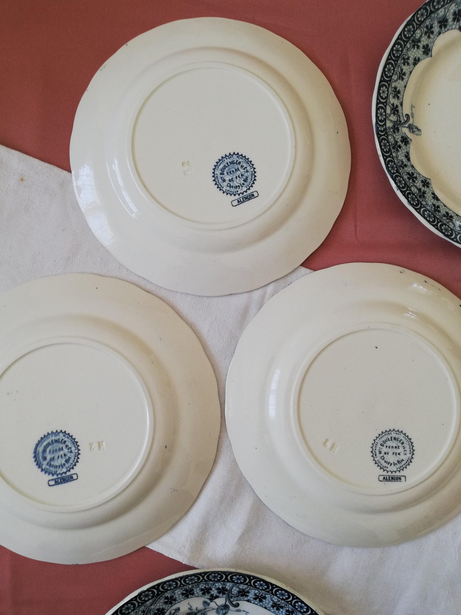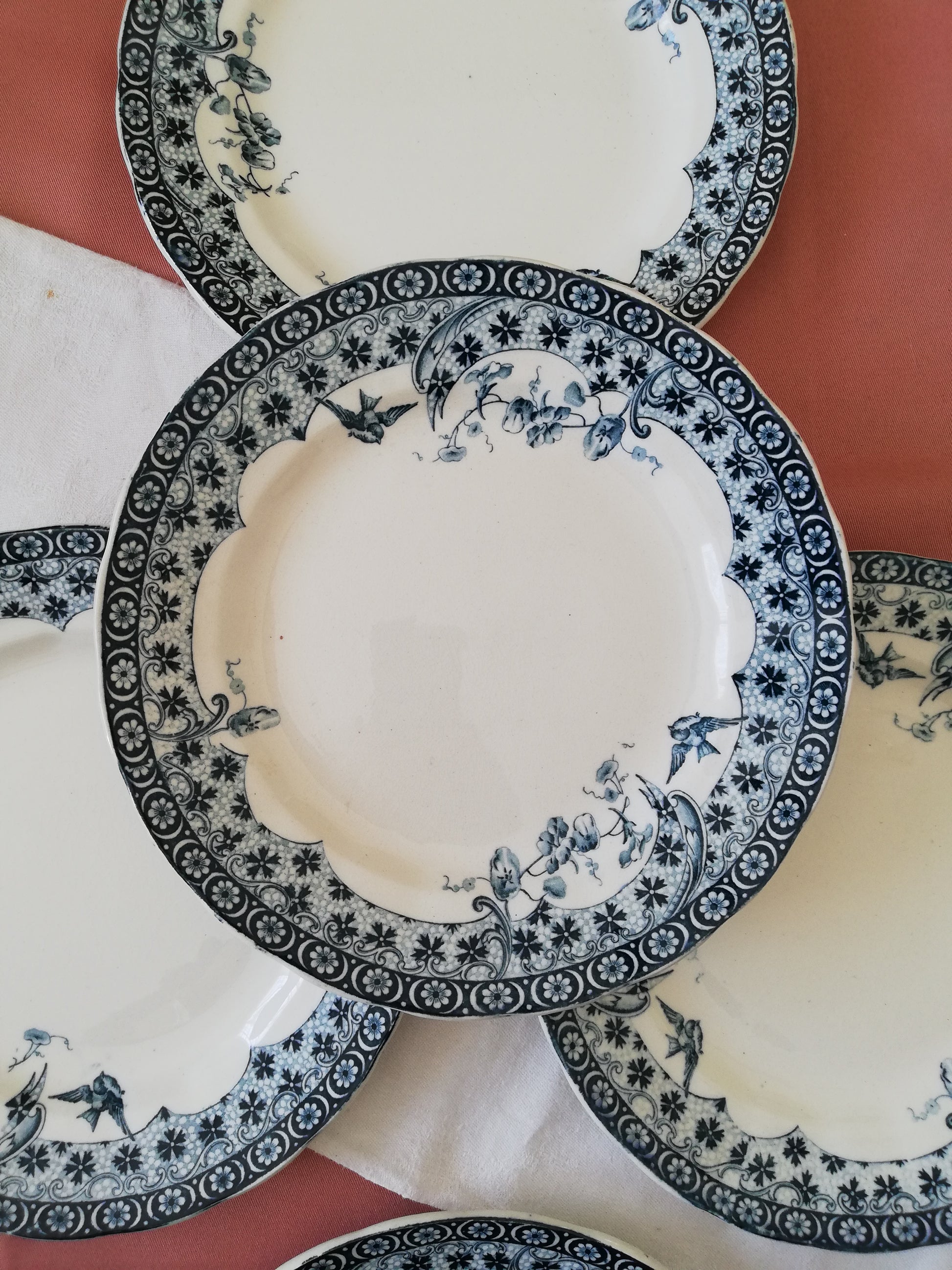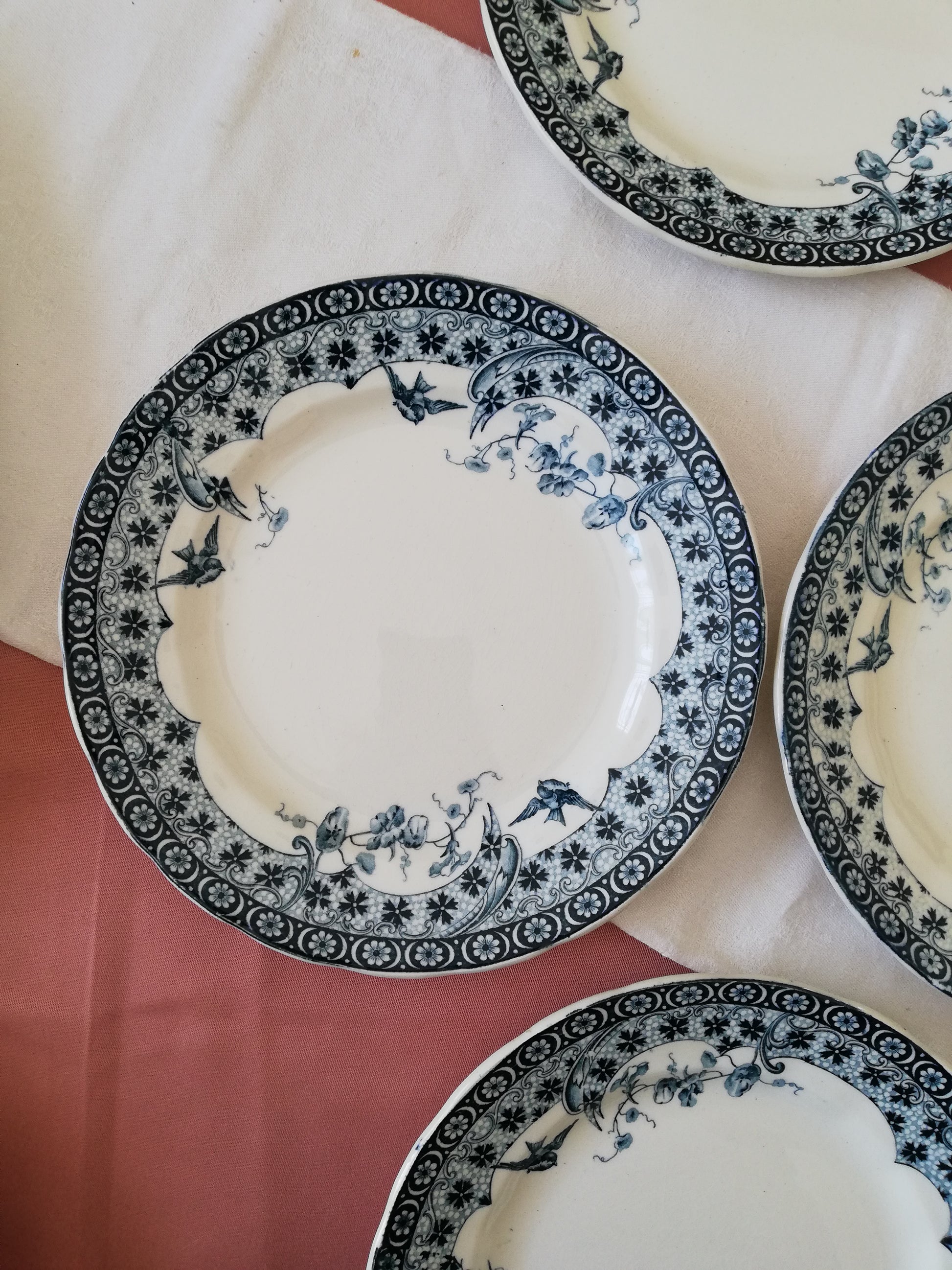 Assiette à dessert en terre de fer bleu modèle Alençon de la manufacture de Choisy le Roi au décor d oiseau, de liseron et de fleurs