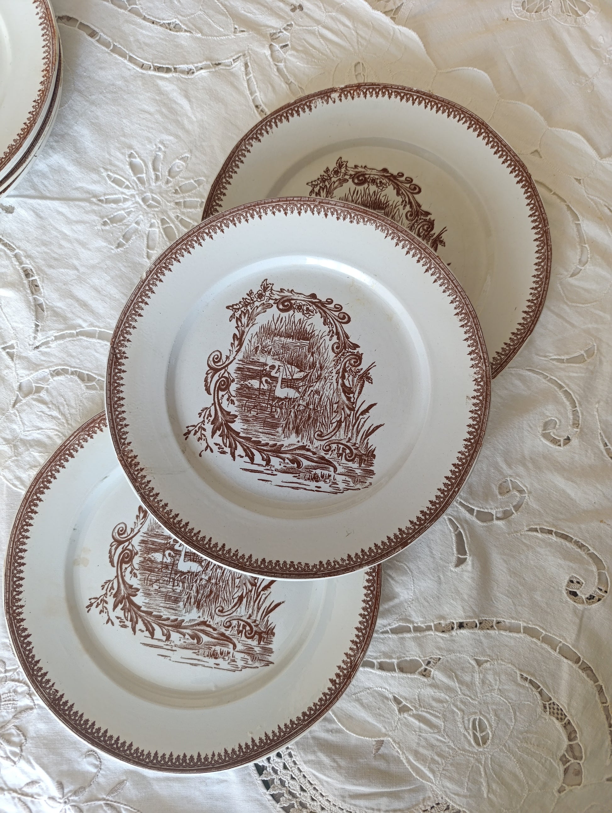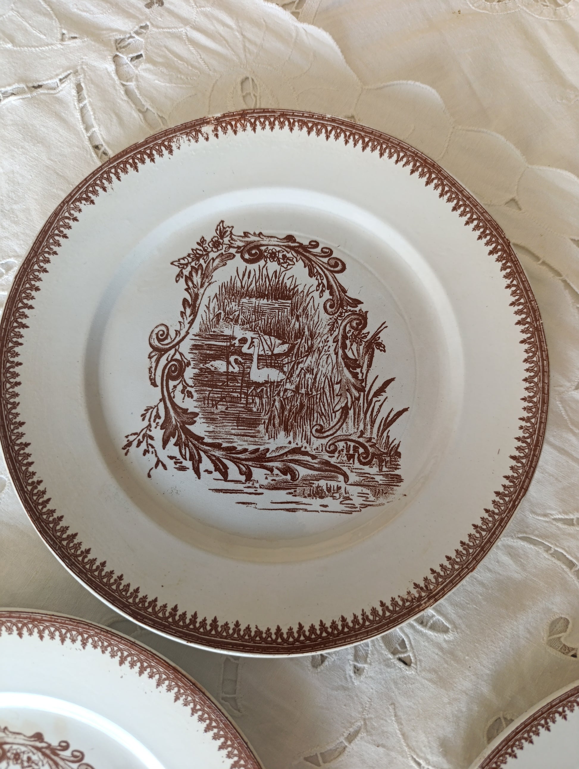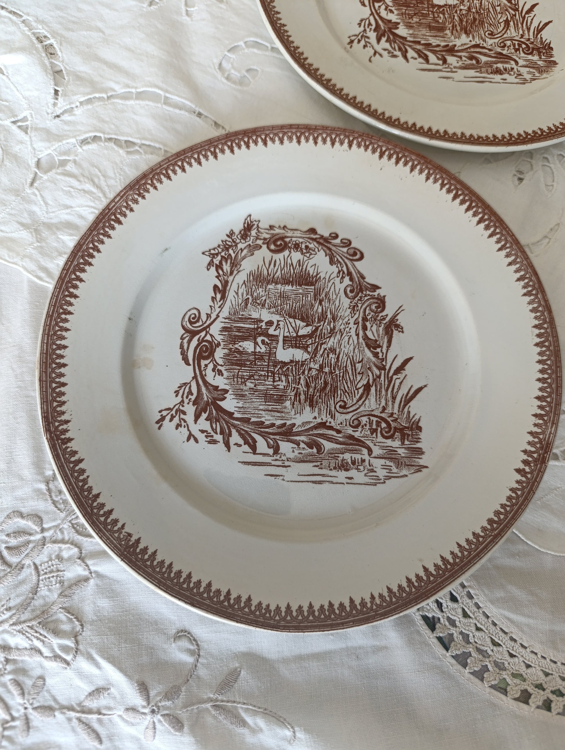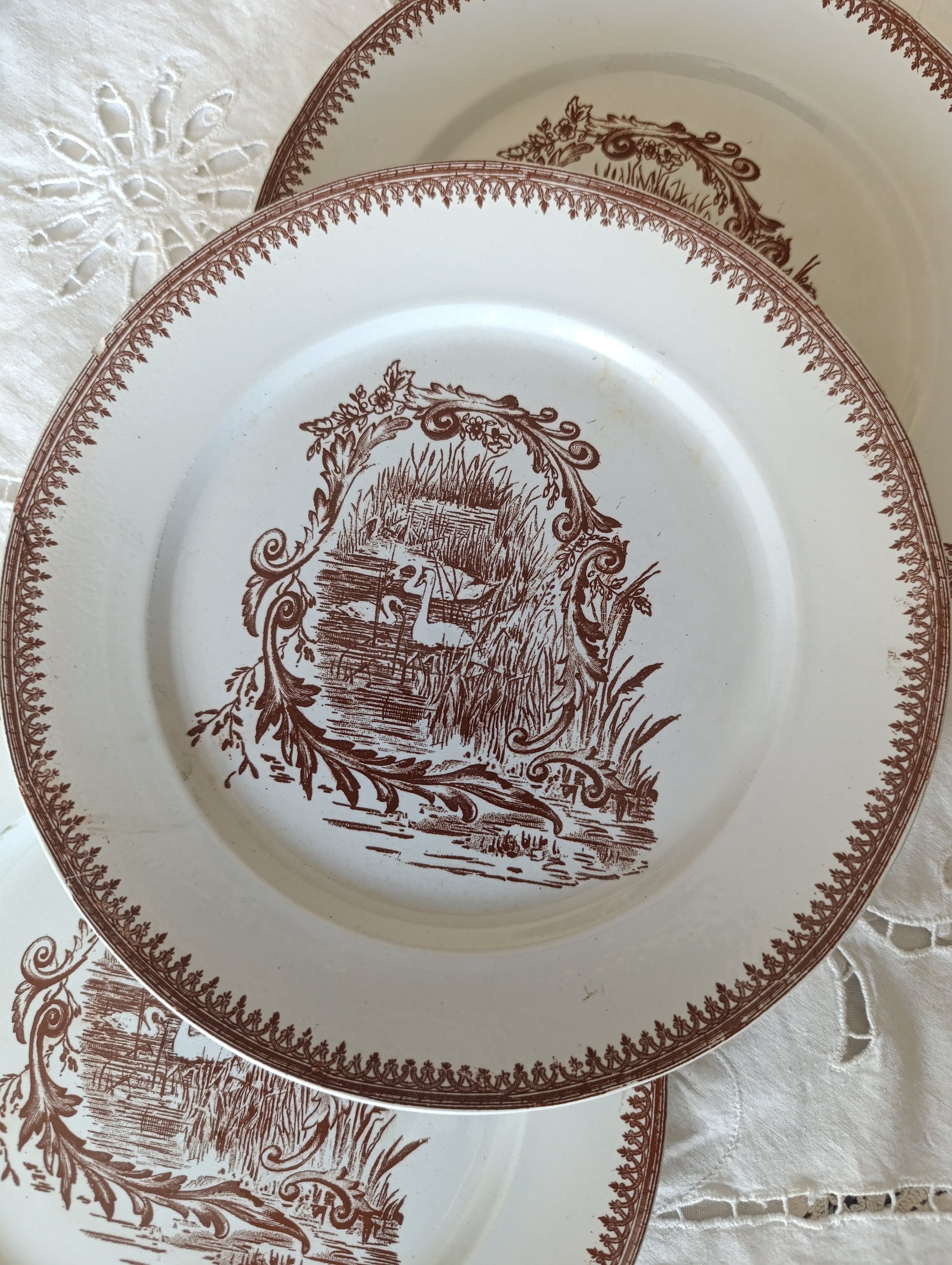 Assiette à dessert en terre de fer brun sépia de la manufacture de pexonne decor cygne