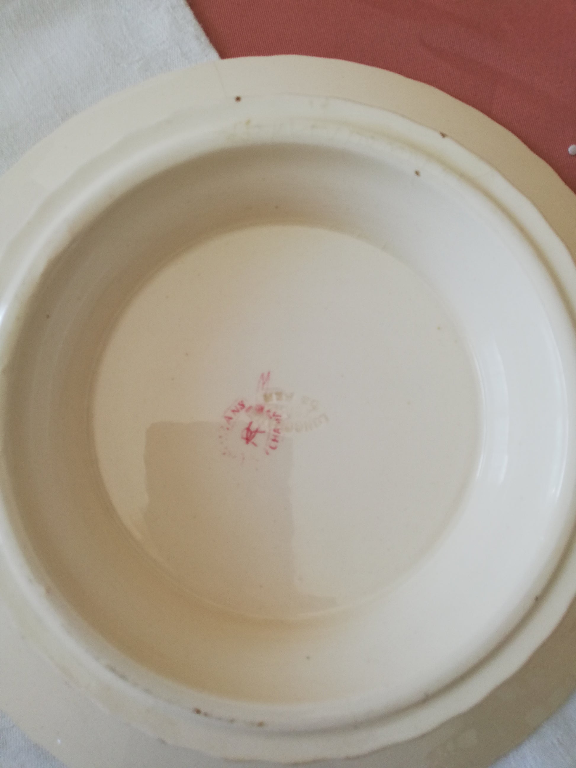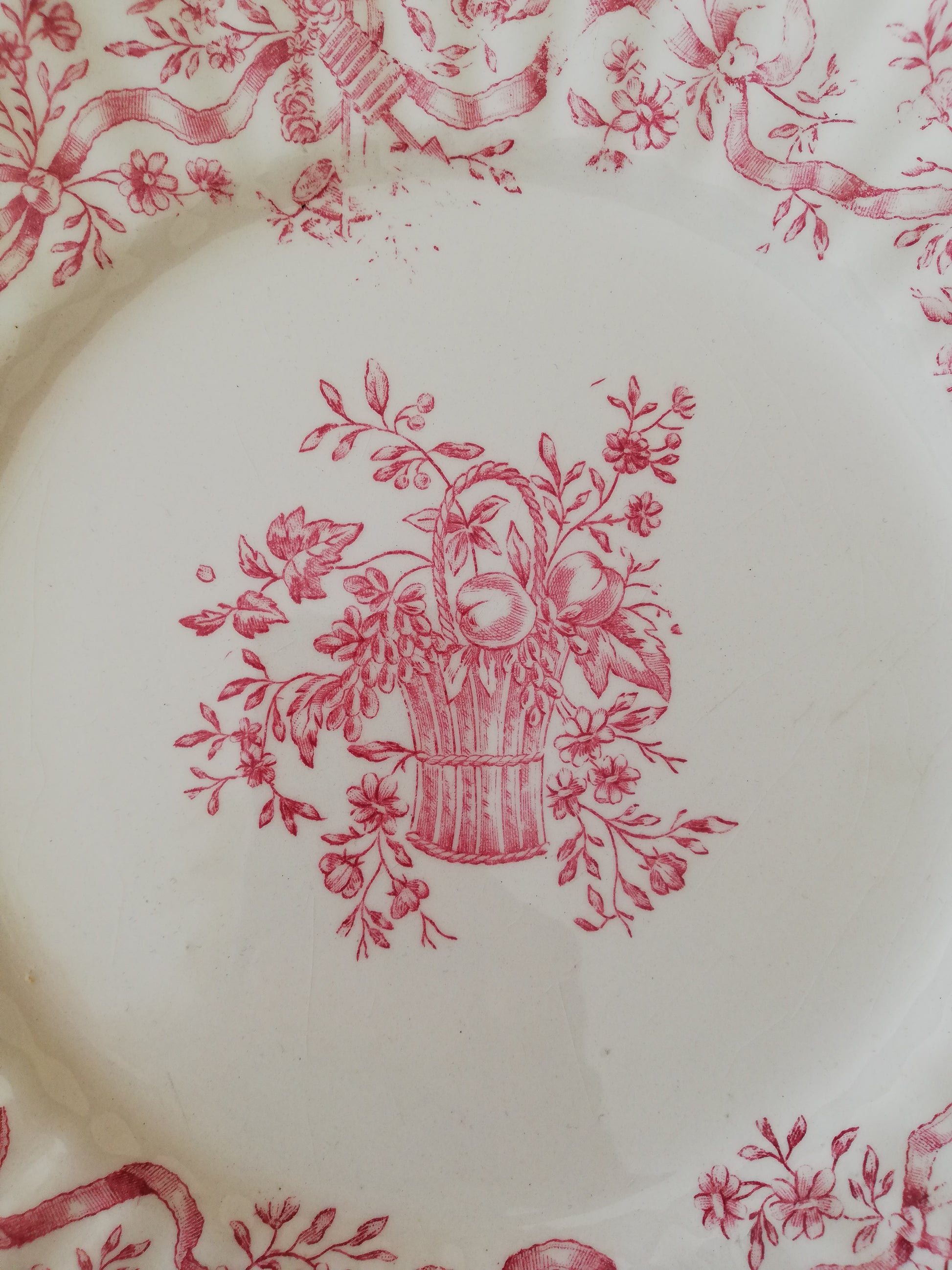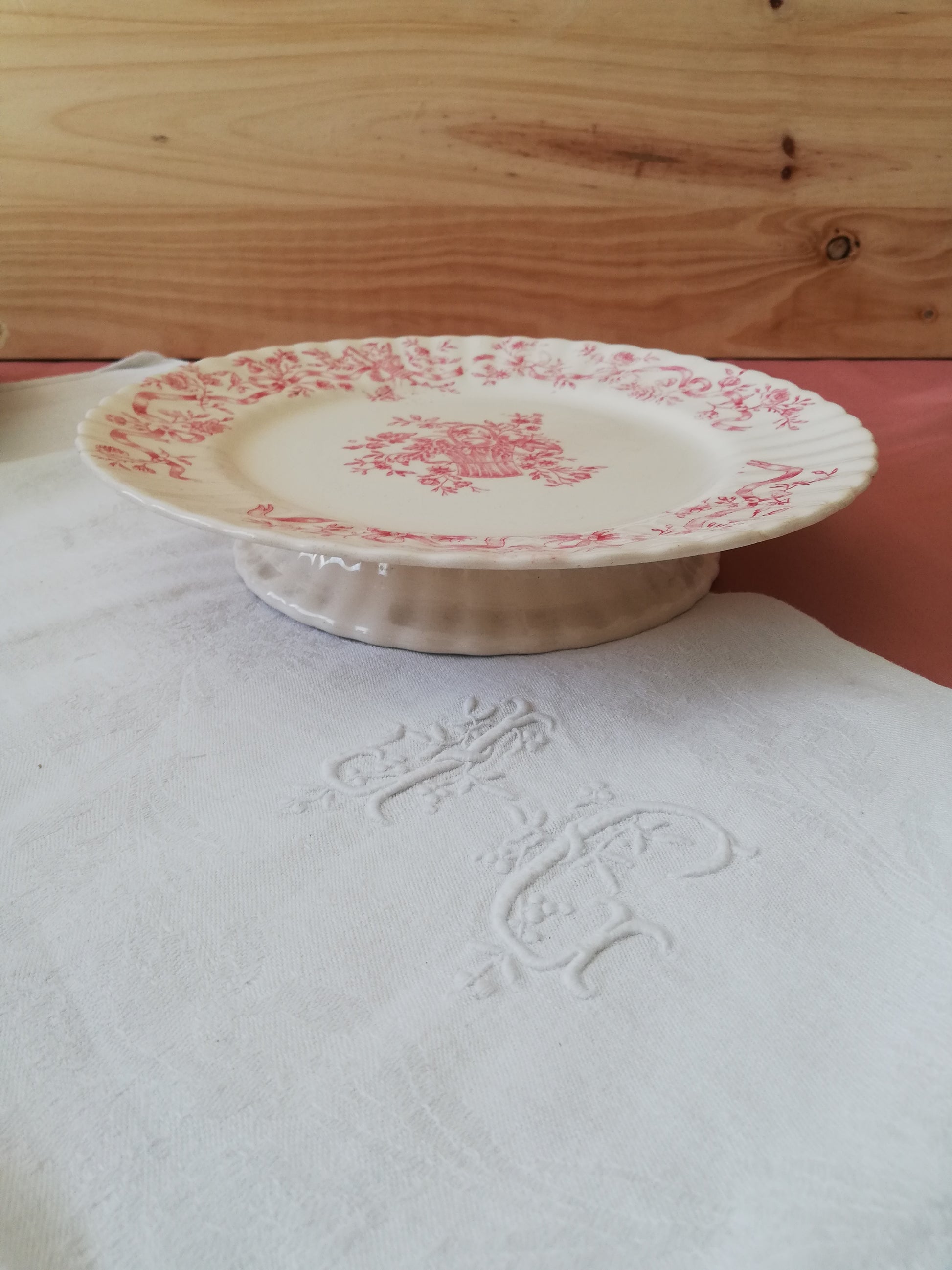 Compotier ou plat à gâteau en terre de fer rose rouge de Longchamp modèle Ruban