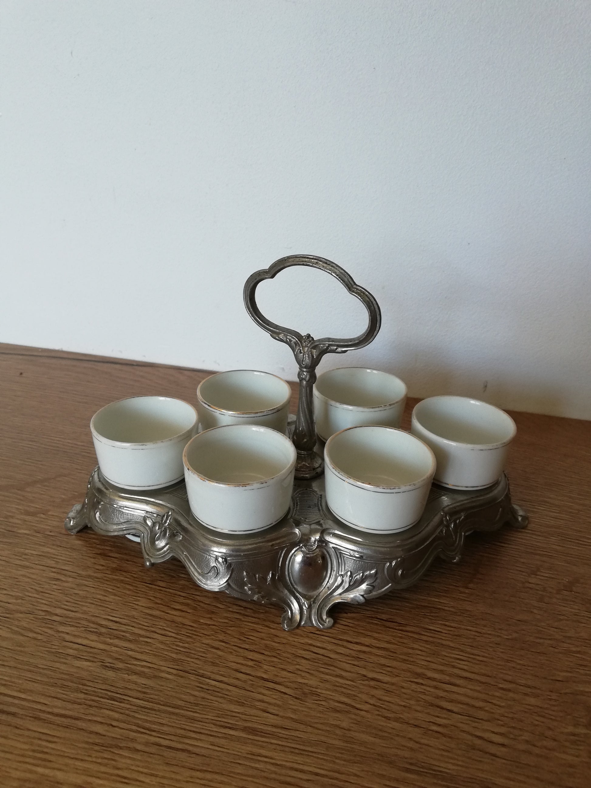 Porte coquetier en métal argenté et 6 coquetiers fin 19eme siècle