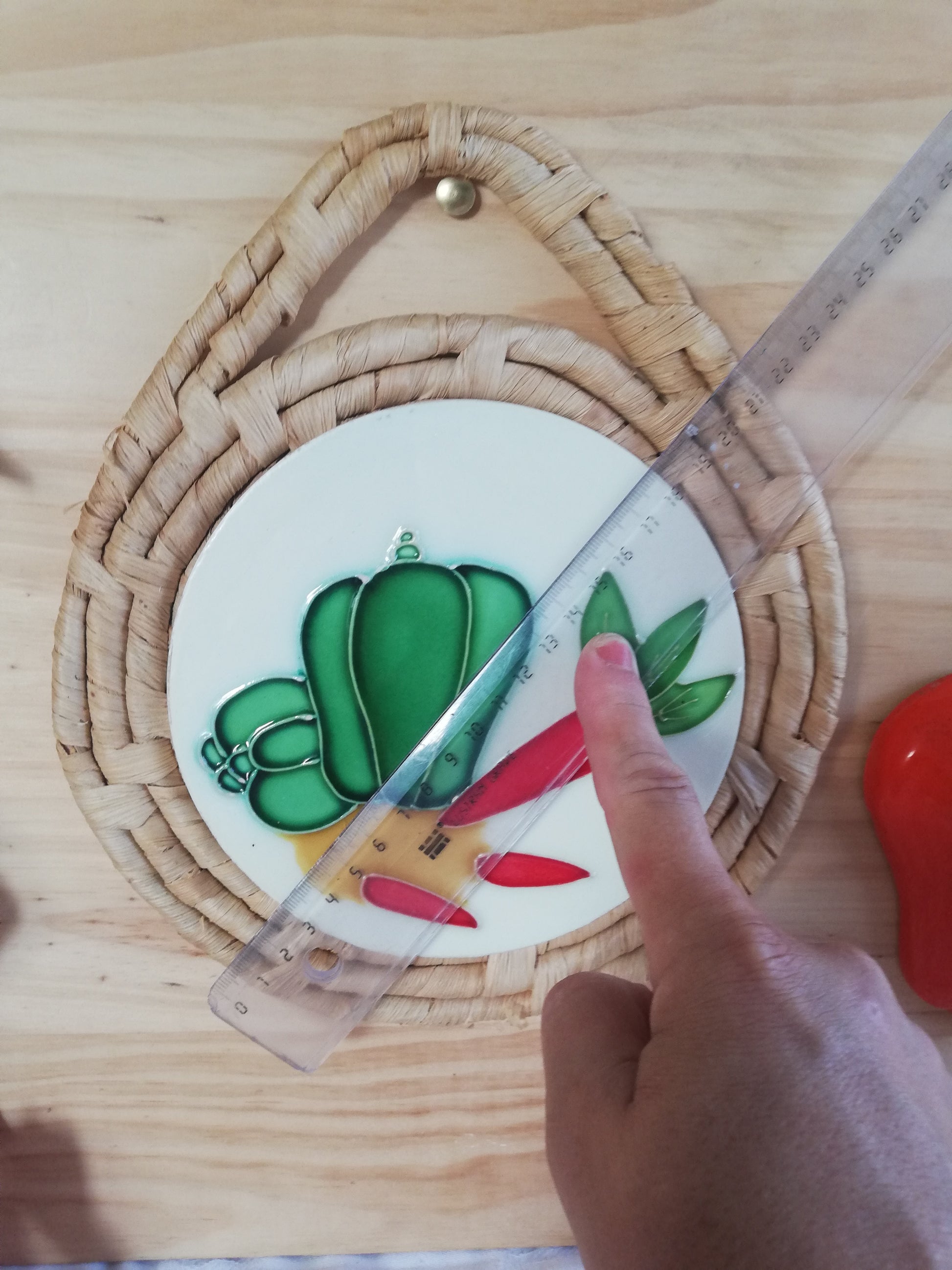 Dessous de plat vintage céramique et raphia, décoré de légumes