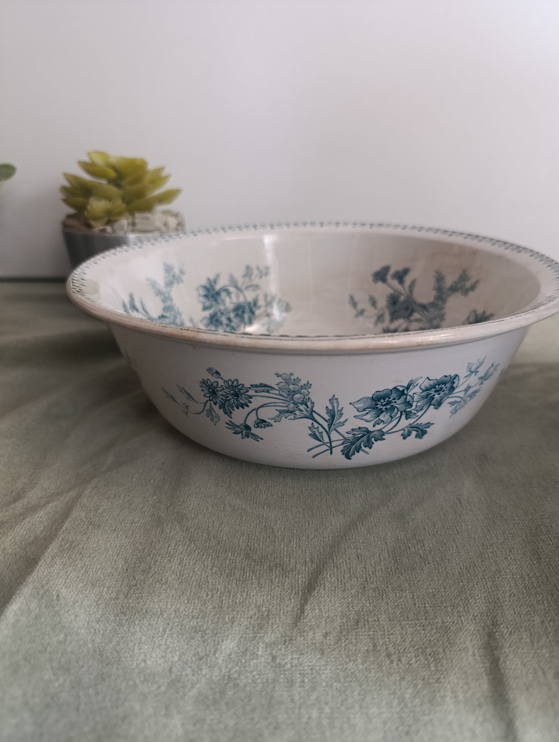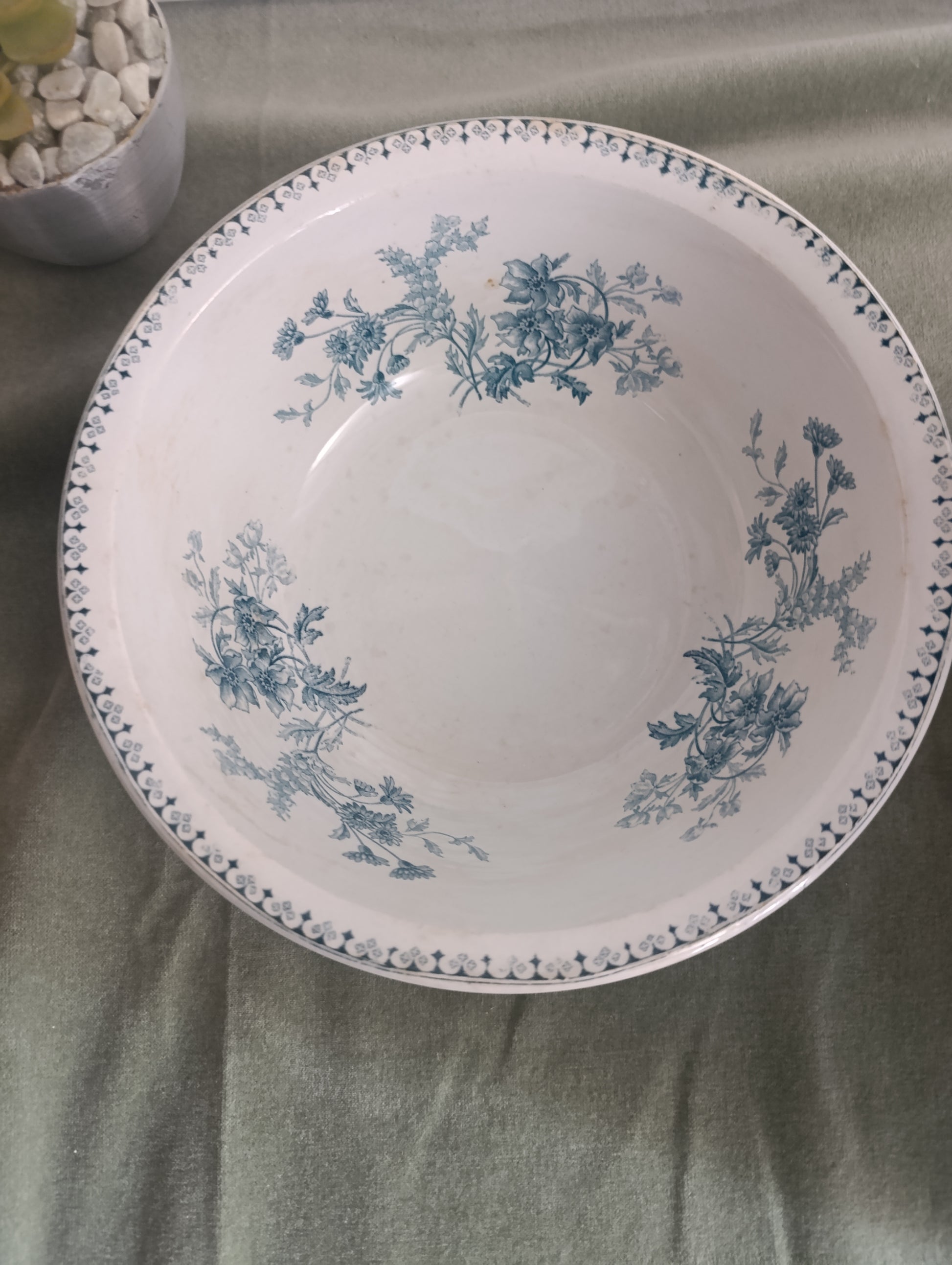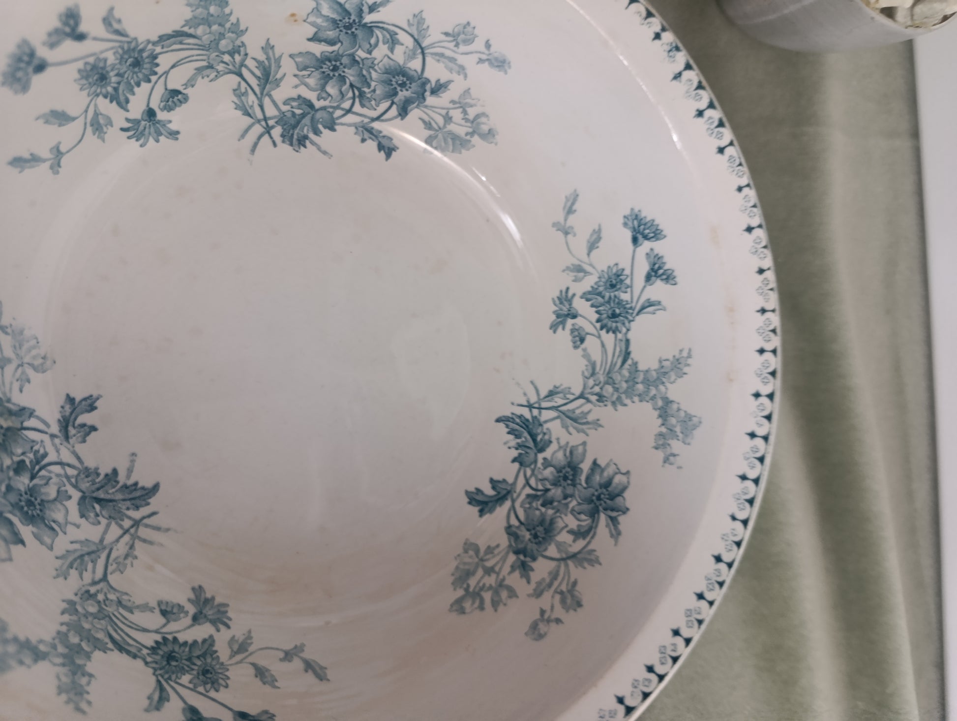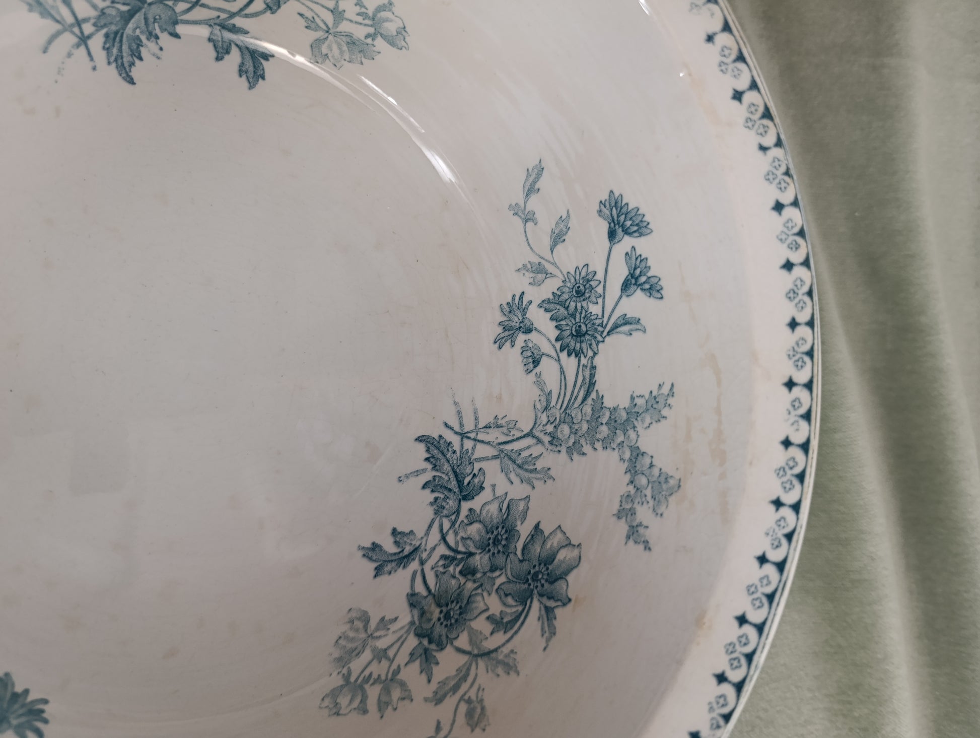Plat rond et haut modèle Elvire de la manufacture de Sarreguemines en terre de fer bleu vert