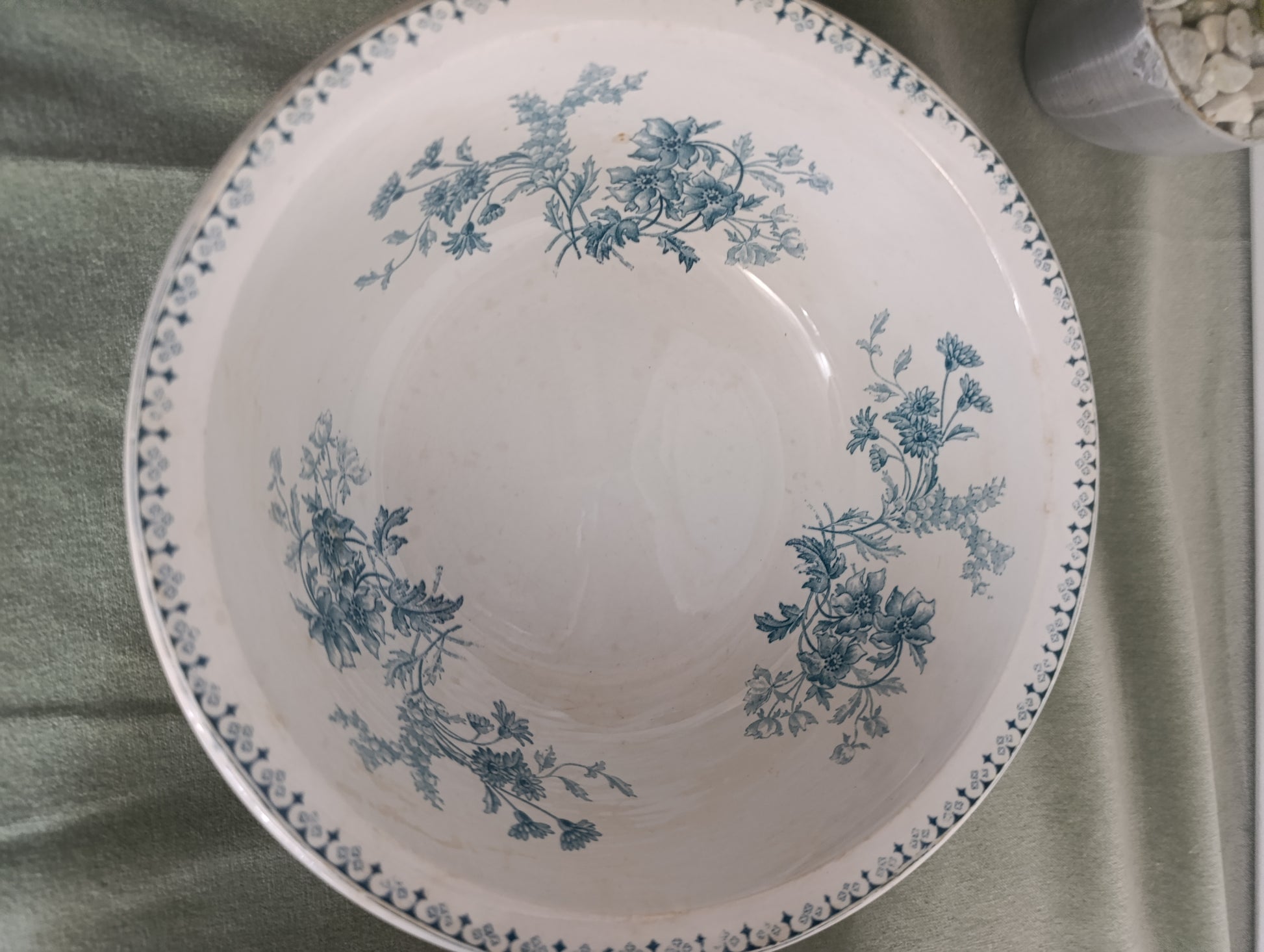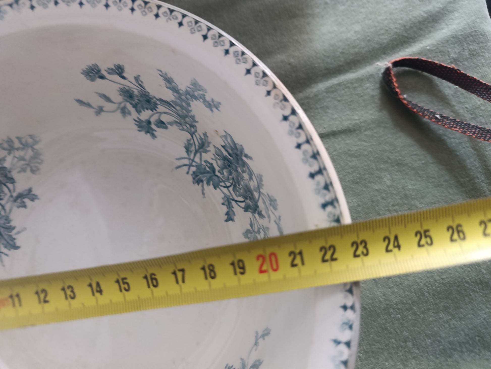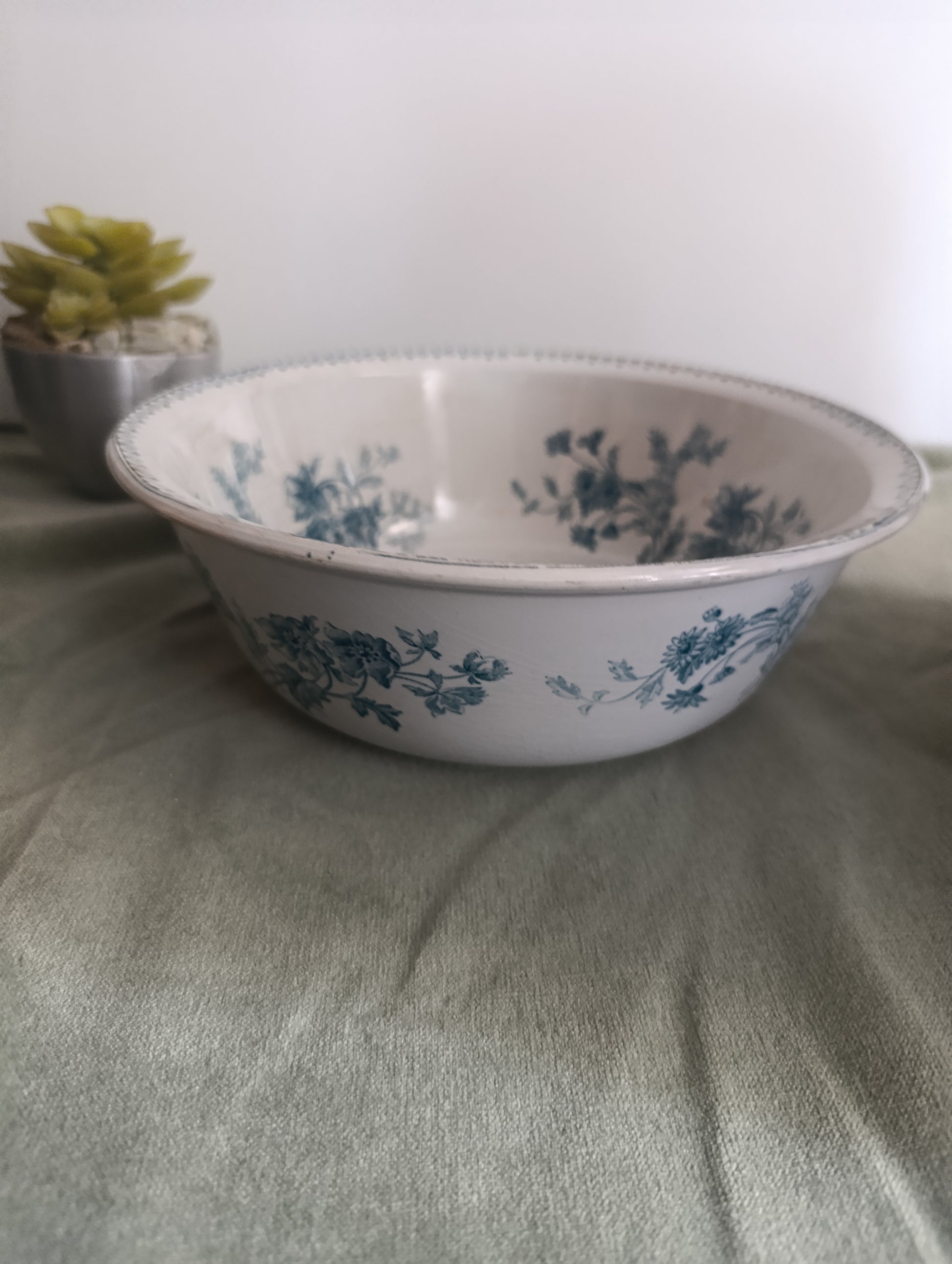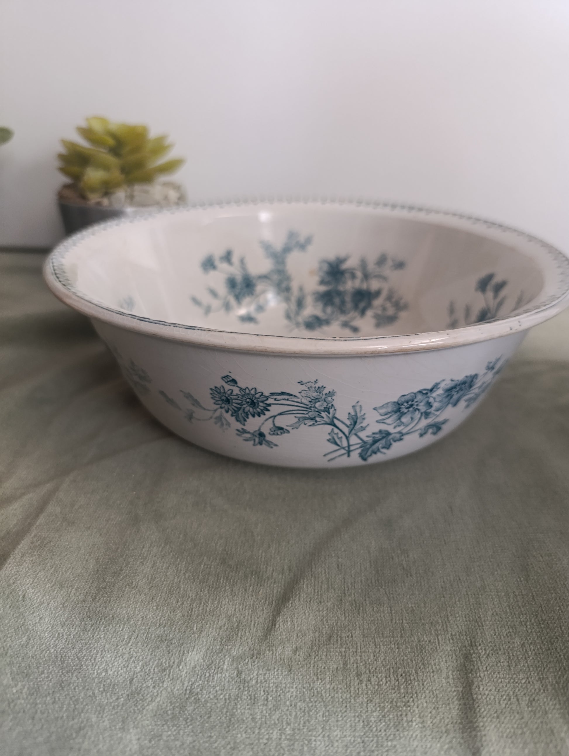 Plat rond et haut modèle Elvire de la manufacture de Sarreguemines en terre de fer bleu vert